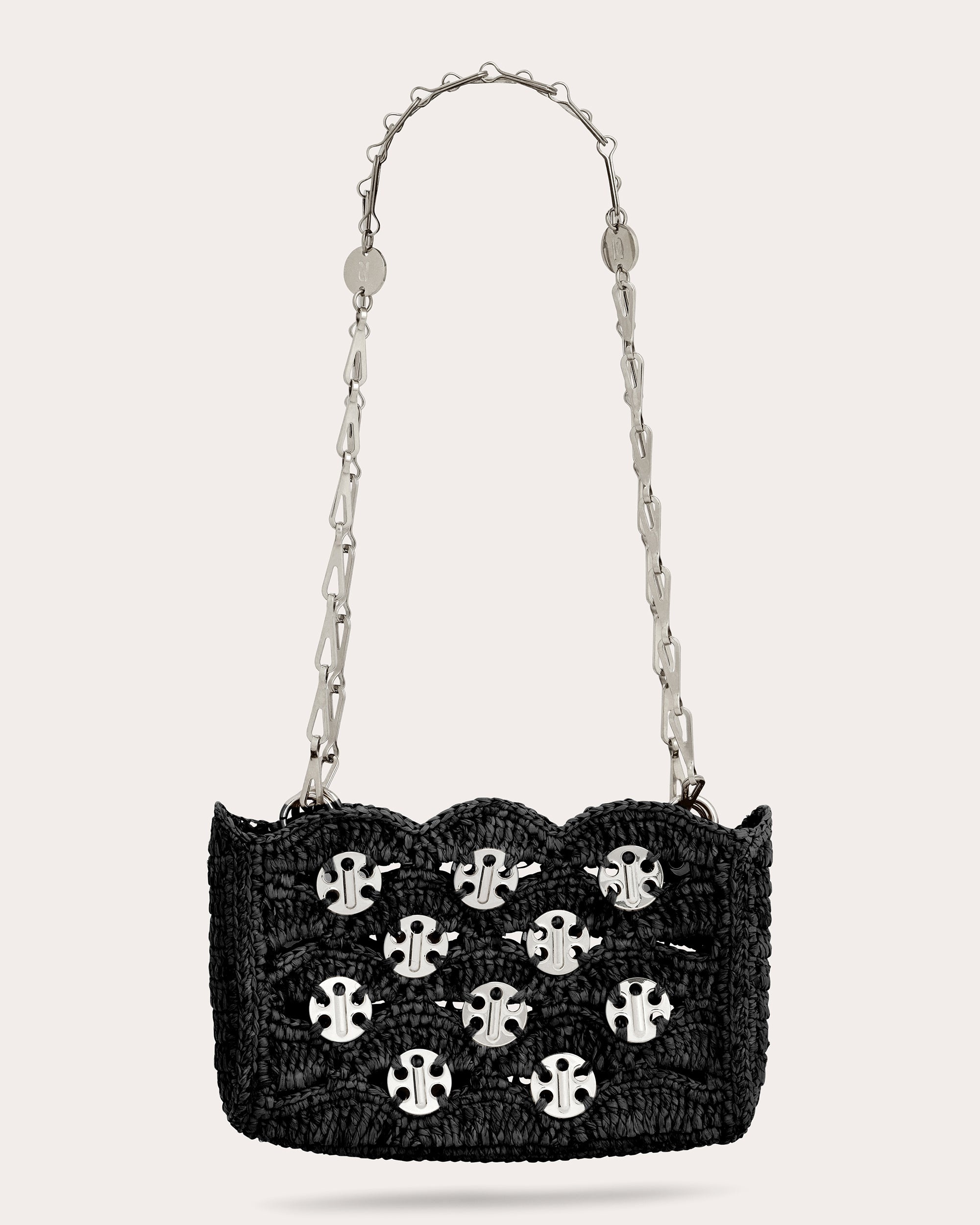 A bohemian re-imagining of the iconic 1969 silhouette, this bite-sized bag decorates its crocheted raffia body with signature silver-tone discs. The chain link straps display engraved monogram medallions—a nod to the identity and expertise of the House of Rabanne. Designer color name: Black Natural Raffia Chain link straps Engraved monogram medallions (straps) 1969 disc embellishments Silver-tone hardware Crocheted raffia 90% raffia, 10% brass Spot clean Made in Madagascar Measurements Width: 6.1in Height: 4.52in Depth: 0.98in