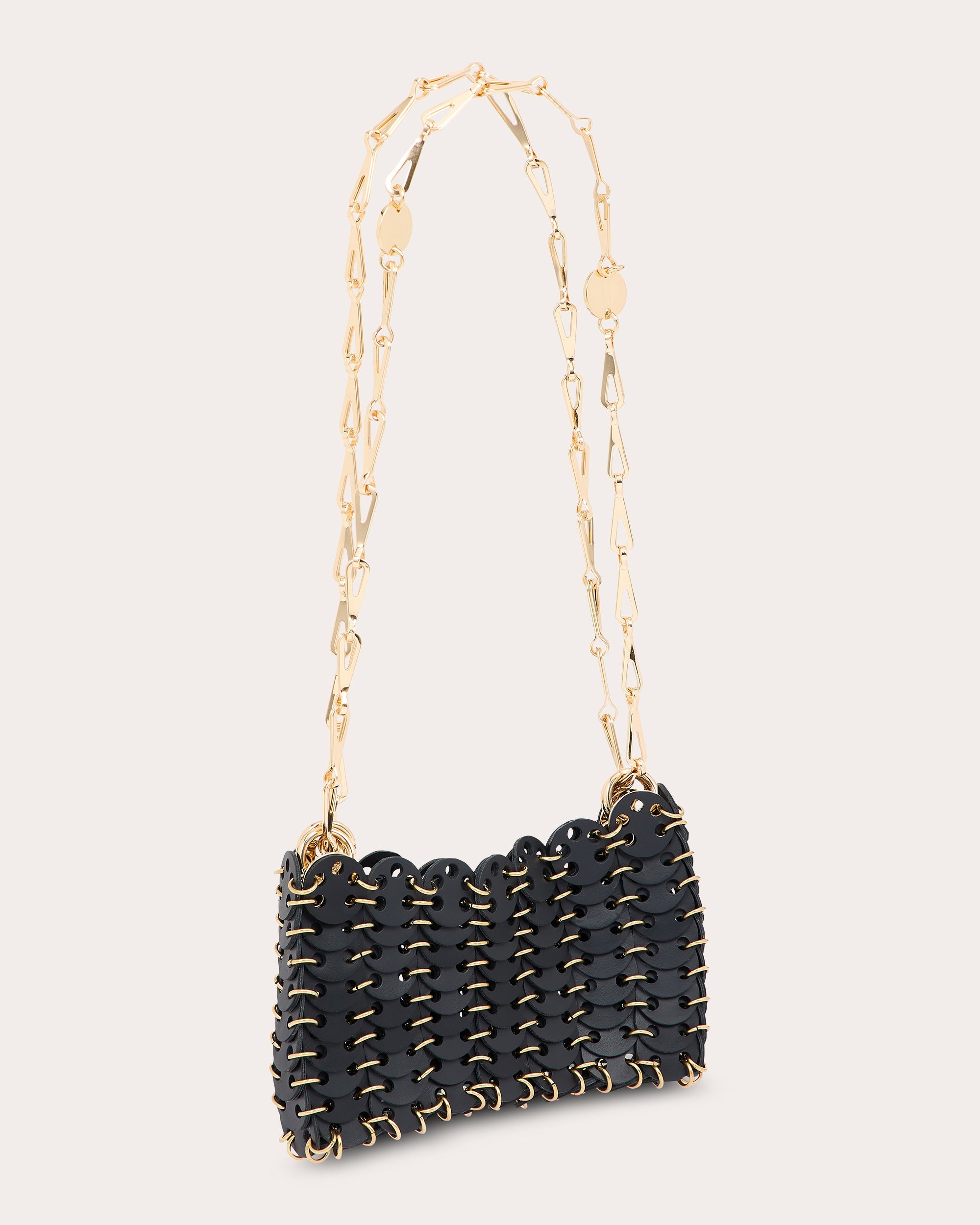 A re-imagining of the iconic 1969 silhouette, this pliable mini bag is comprised of black leather discs bonded together by smaller gold-tone rings—a true reflection of the identity and expertise of the House of Rabanne. The chain link strap is removable for clutch-style carrying. Designer color name: Black/Gold Detachable chain strap Gold-tone hardware Leather discs Metal ring bonding 80% leather, 20% steel Clean with soft cloth Made in Madagascar Measurements Width: 6.1in Height: 4.52in Depth: 0.98in