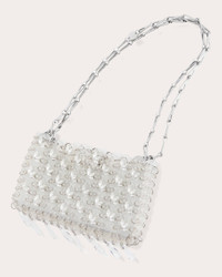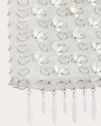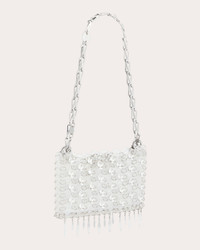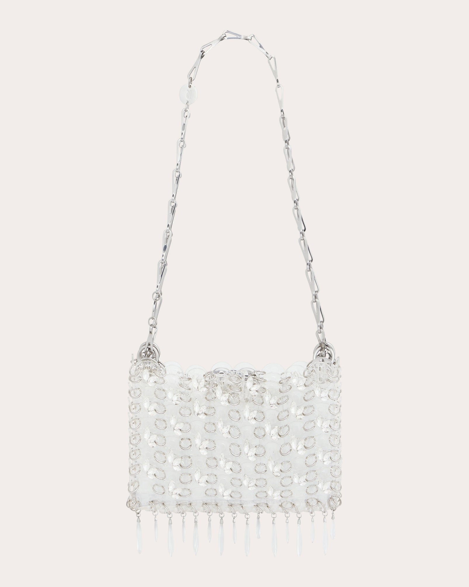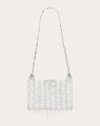 A nod to inaugural 1969 designs, this pliable shoulder bag is comprised of signature transparent discs bonded together by smaller metal rings—a true reflection of the identity and expertise of the House of Rabanne. Engraved monogram medallions and strass crystal embellishments reflect elevated attention to detail. Designer color name: Transparent / Silver Magnetic closure Chain link straps Engraved monogram medallions (straps) Transparent resin signature 1969 discs Metal ring bonding Transparent strass crystal embellishments 70% acrylic, 20% steel, 10% glass Spot clean Made in Madagascar Measurements Width: 7.48in Height: 4.33in Depth: 1.18in