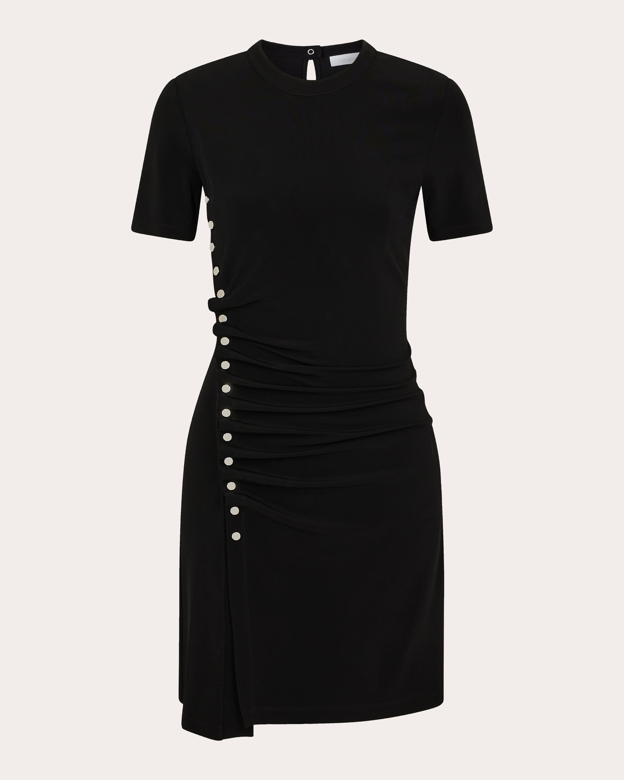 An iconic Rabanne silhouette, this short-sleeve dress is decorated with silvertone buttons down one side to create an asymmetric draped effect. Stretch-infused fabric and ruched detailing throughout the bodice offer a universally flattering fit. Back button keyhole closure Silvertone snap button details Ruched bodice Asymmetric slit hem Self: 95% viscose, 5% elastane Dry clean only Made in Portugal Size & Fit Size FR 34 (US 2 / XS): 31.89in chest, 24.02in waist, 34.25in hips Size FR 36 (US 4 / S): 33.46in bust, 25.59in waist, 35.83in hips Size FR 38 (US 6 / M): 35.04in bust, 27.17in waist, 37.4in hips Size FR 40 (US 8 / L): 36.61in bust, 28.74in waist, 38.98in hips Size FR 42 (US 10 / XL): 38.19in bust, 30.31in waist, 40.55in hips Size FR 44 (US 12 / XXL): 39.76in bust, 31.89in waist, 42.13in hips Please note, above measurements reflect Rabanne's size chart, not the actual garment.