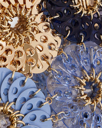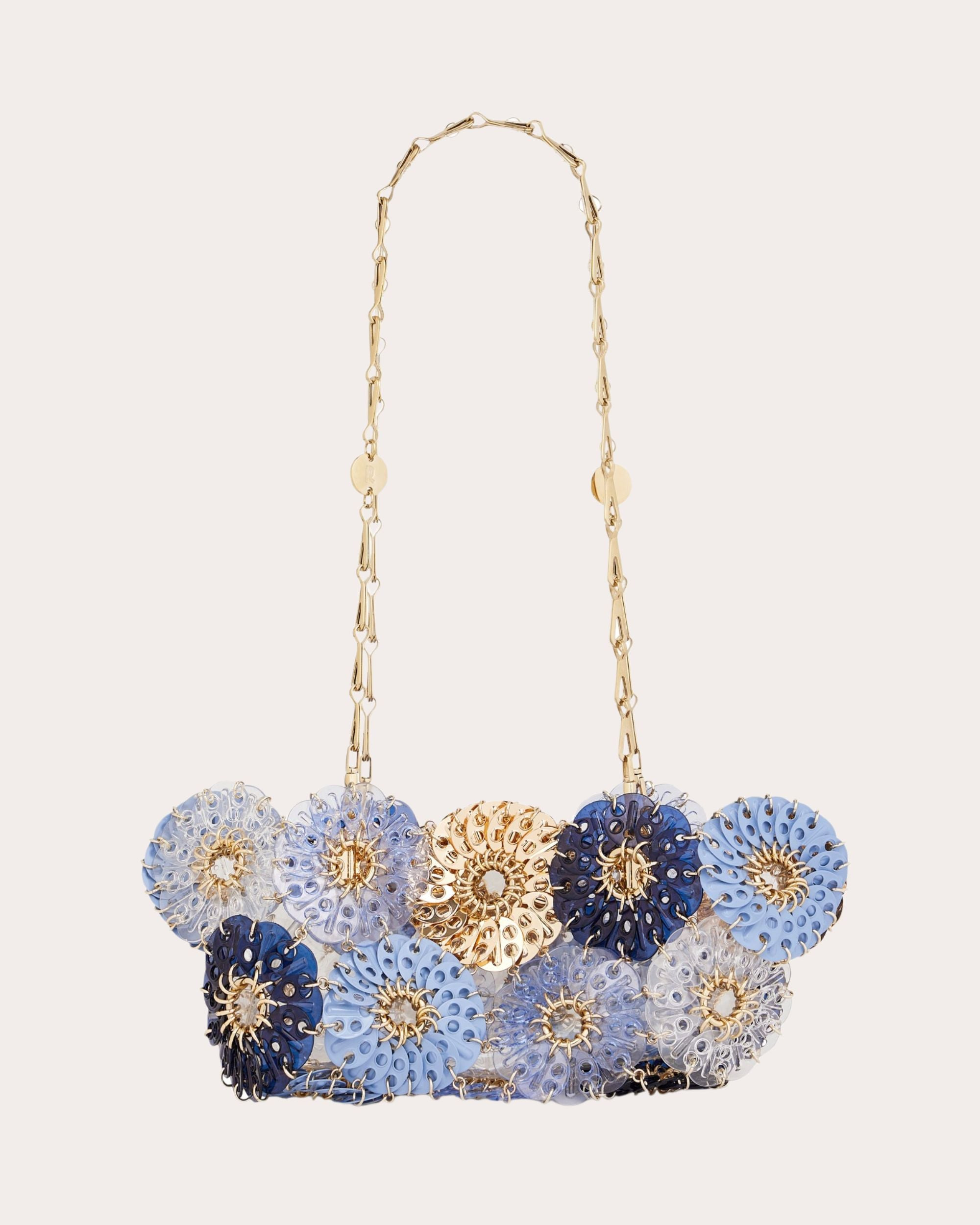 A nod to inaugural Rabanne designs, this pliable shoulder bag forms its floral motifs from signature 1969 discs bonded together by smaller metal rings. The goldtone chain link straps are decorated with engraved monogram medallions. Designer color: blue and gold Magnetic closure Chain link straps Engraved monogram medallions (straps) Signature 1969 disc flowers Metal ring bonding Outer: 70% acetate, 20% goldtone brass, 10% steel Lining: 100% PVC Spot clean Made in Madagascar