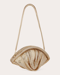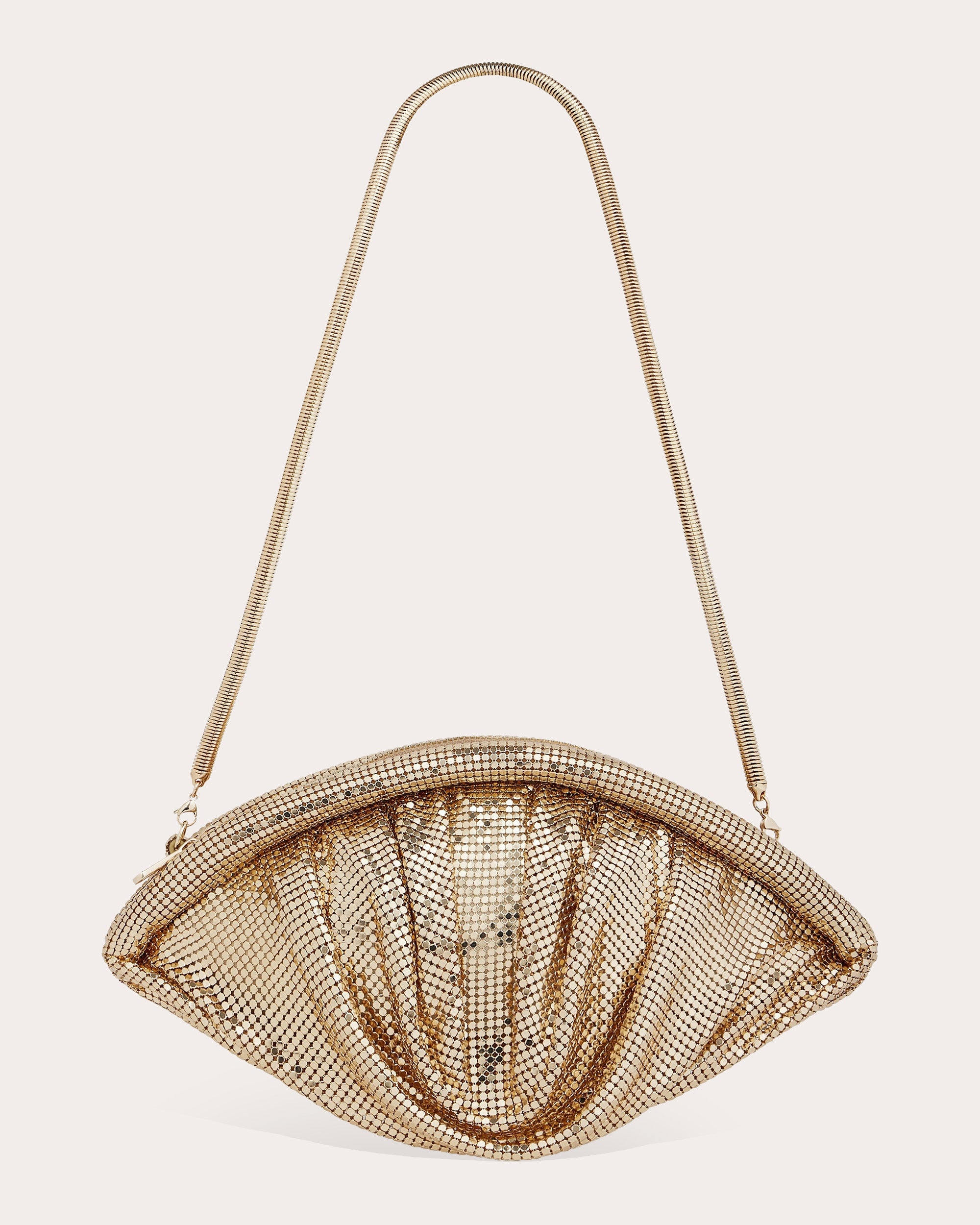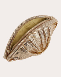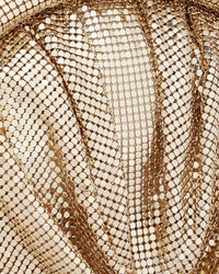 A nod to Rabanne's roots, this iconic clutch overlays its structured top frame with gold chainmail mesh to create a fluid effect. The two-way zip closure keeps items stored safely inside. Designer color name: Gold Zip closure Structured top frame Removable shoulder strap Draped chainmail mesh Outer: 100% gold-tone brass Lining: 100% leather Spot clean Made in China Measurements Width: 14.96in Height: 5.51in Depth: 1.18in