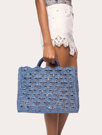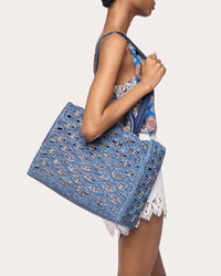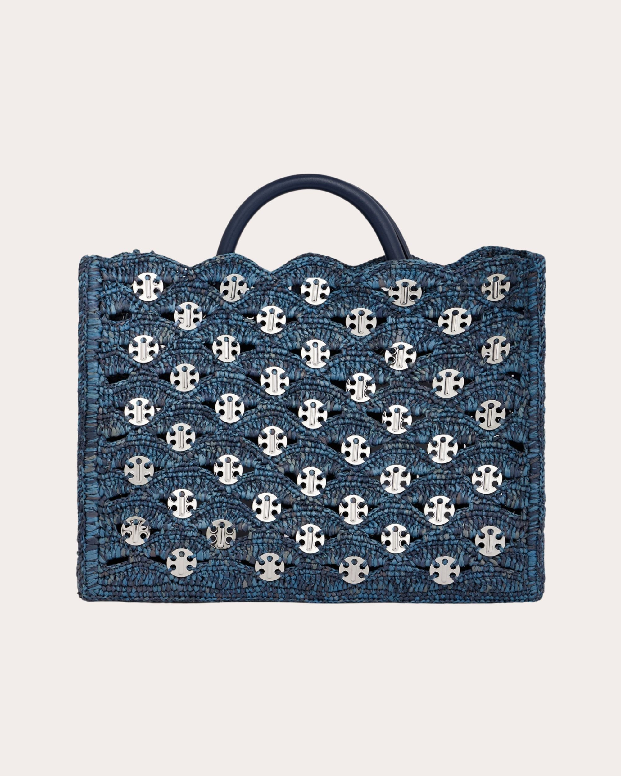A nod to inaugural Rabanne designs, this tote bag decorates its crocheted raffia body with signature 1969 silver discs. Top handles and detachable shoulder straps allow for versatile carrying. Designer color: blue denim and silver Includes detachable shoulder straps Magnetic closure 1969 silver disc embellishments Crocheted raffia Outer: 80% raffia, 10% leather, 10% silvertone brass Lining: 100% cotton Spot clean Made in Madagascar Measurements Width: 13.77in Height: 10.63in Depth: 2.36in