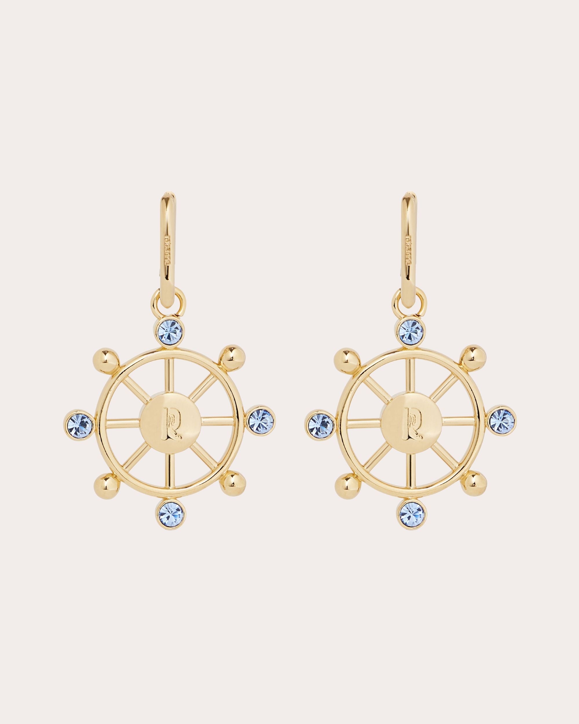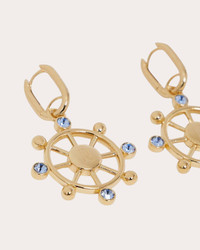 Crafted from polished goldtone brass, these Rabanne earrings display rudder-inspired drops. Blue crystal embellishments mimic the glistening hues of the sea. Hinge click closure Engraved monograms Goldtone brass and crystal Polish with soft cloth Made in Italy