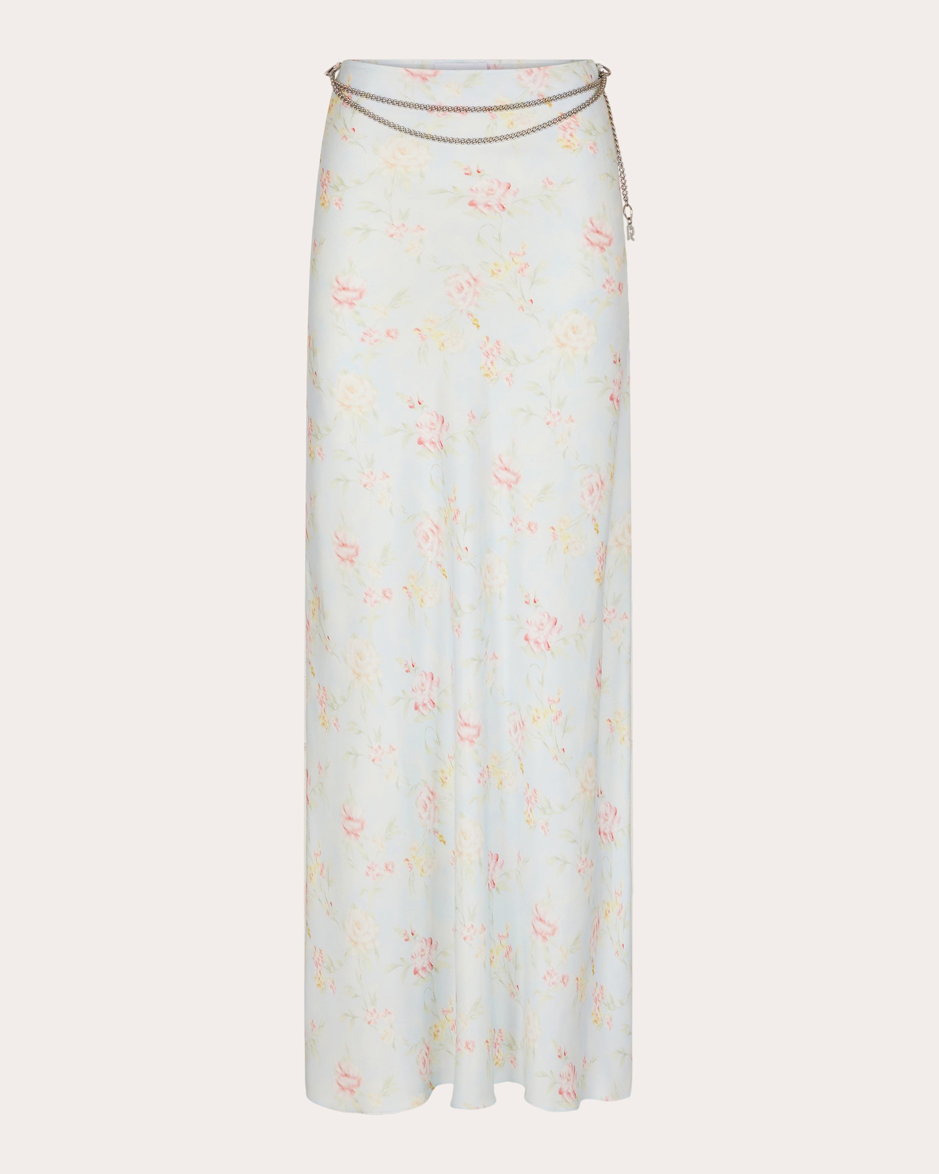 Dreamt up in floral-print satin, this Rabanne skirt decorates its waist with draped silver chains. The slip-inspired silhouette is cut with an A-line shape for fluid movement. Designer color name: Waterflower Pink Zip closure Silver chain embellishments Satin Self: 100% polyester Dry clean Made in Tunisia Size & Fit Garment measurements (size FR 34 / US 2): 34.4in bust, 38.75in hips Fits true to size. Designed to be worn at the waist. Lightweight, non-stretchy fabric. Please note, below measurements reflect Rabanne's size chart, not the actual garment. Size FR 34 (US 2 / XS): 31.89in chest, 24.02in waist, 34.25in hips Size FR 36 (US 4 / S): 33.46in bust, 25.59in waist, 35.83in hips Size FR 38 (US 6 / M): 35.04in bust, 27.17in waist, 37.4in hips Size FR 40 (US 8 / L): 36.61in bust, 28.74in waist, 38.98in hips Size FR 42 (US 10 / XL): 38.19in bust, 30.31in waist, 40.55in hips Size FR 44 (US 12 / XXL): 39.76in bust, 31.89in waist, 42.13in hips