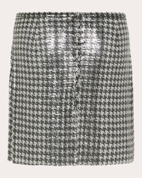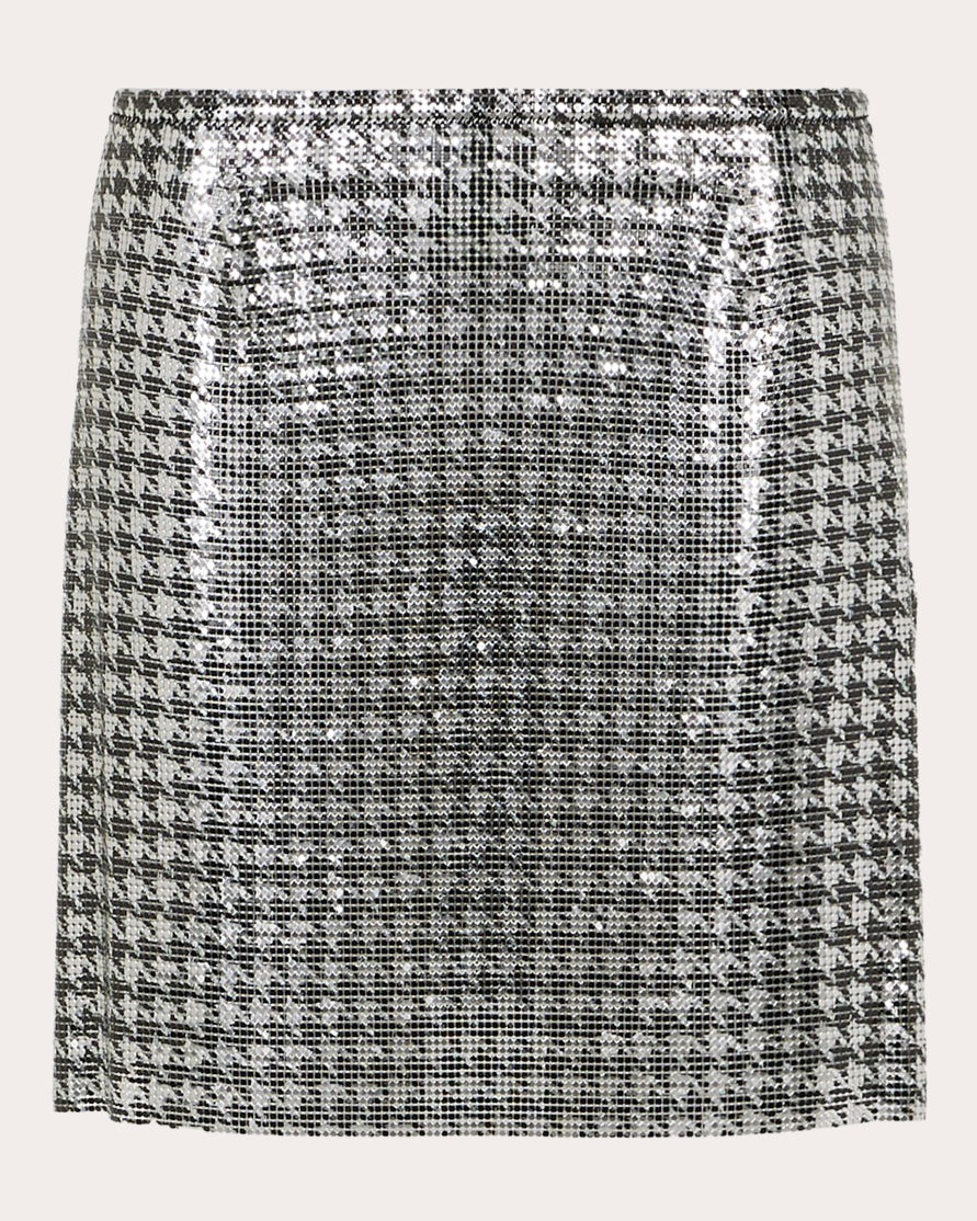 A maximum-impact mini, this Rabanne skirt decorates its silver mesh silhouette with classic houndstooth patterning. Darted waist seams and side slits at the hem create flattering, feminine shape. Designer color name: Silver Back button closure Darted waist seams Side-slit hem details Unlined Houndstooth mesh Self: 100% aluminum Spot clean only Made in Madagascar Size & Fit Garment measurements (size FR 36 / US 4): 16in long, 28in waist, 36in hips Fits true to size. If you are in between sizes we recommend taking the smaller size. Mid-weight, non-stretchy material. Designed to be worn right below natural waist. Please note, below measurements reflect Rabanne's size chart, not the actual garment. Size FR 34 (US 2 / XS): 31.89in chest, 24.02in waist, 34.25in hips Size FR 36 (US 4 / S): 33.46in bust, 25.59in waist, 35.83in hips Size FR 38 (US 6 / M): 35.04in bust, 27.17in waist, 37.4in hips Size FR 40 (US 8 / L): 36.61in bust, 28.74in waist, 38.98in hips Size FR 42 (US 10 / XL): 38.19in bust, 30.31in waist, 40.55in hips Size FR 44 (US 12 / XXL): 39.76in bust, 31.89in waist, 42.13in hips