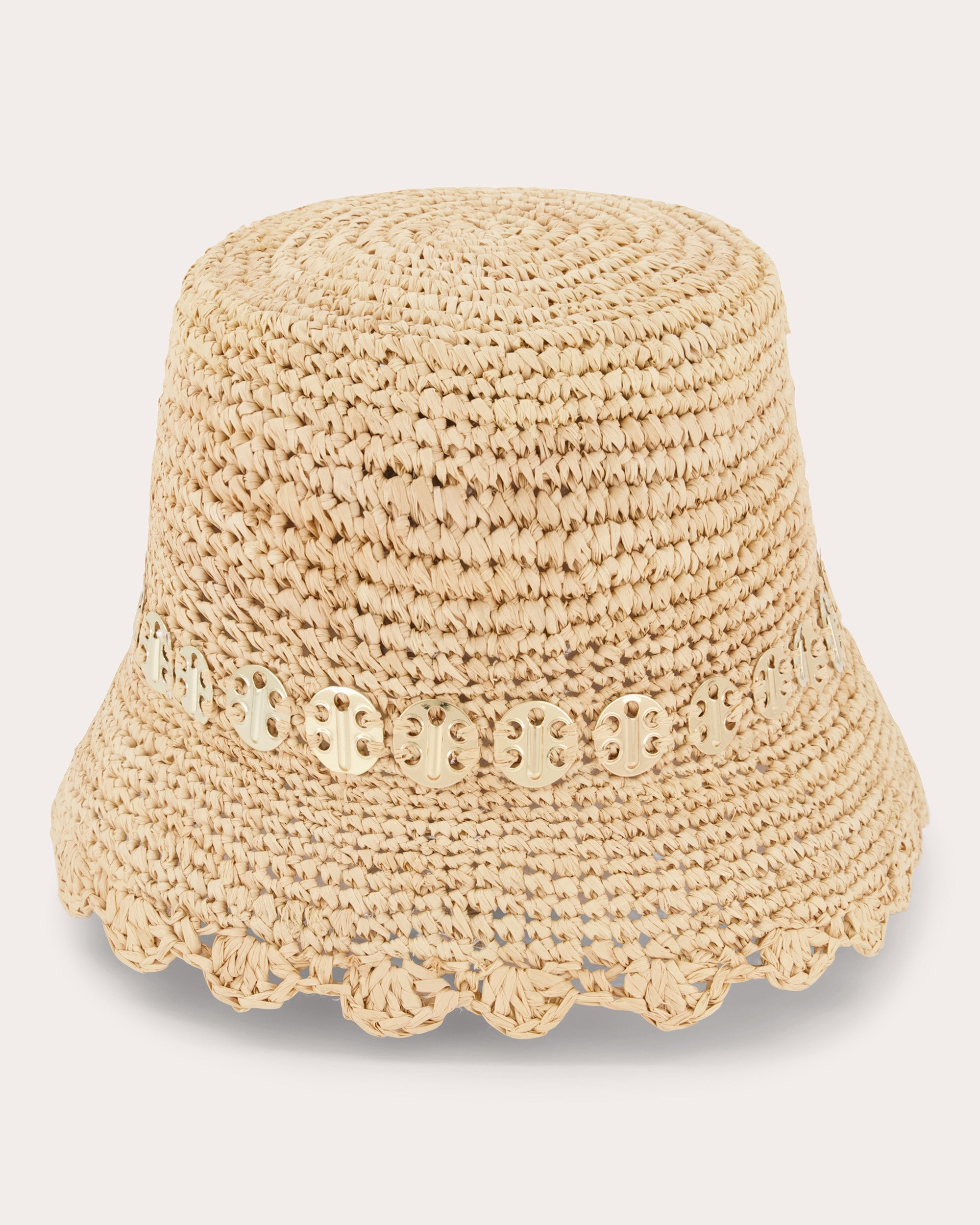 A bohemian nod to Rabanne's iconic 1969 collections, this woven raffia hat is decorated with signature gold-tone discs. The flat top and downward slanted brim reflect classic bucket silhouettes. Designer color name: Natural/Light Gold Gold-tone 1969 disc embellishments Self: 100% woven raffia Discs: 100% brass Spot clean Imported Size & Fit Crown diameter: 6.69in
