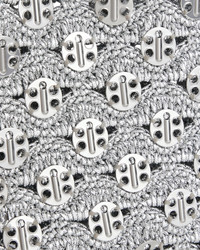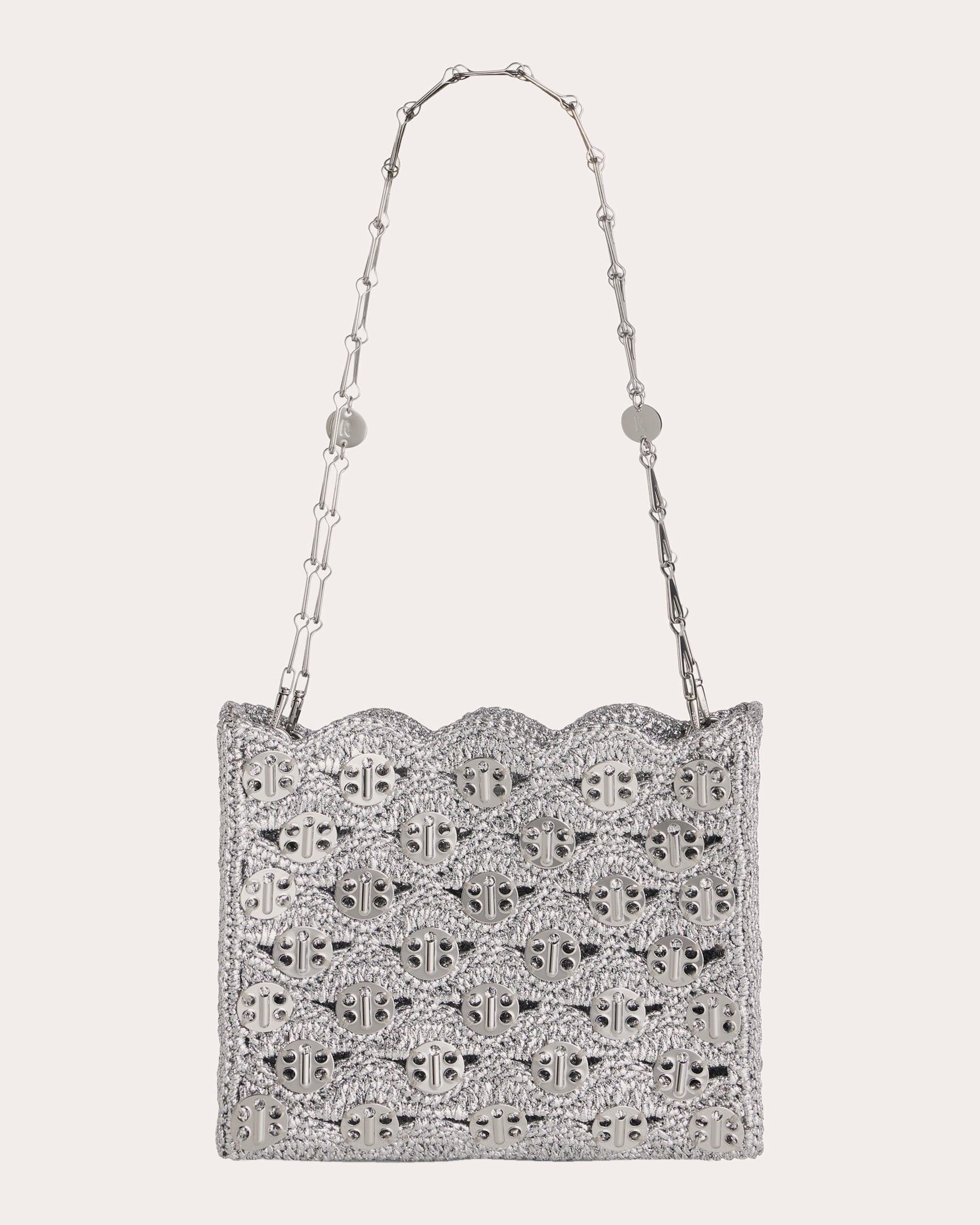 A bohemian re-imagining of the iconic 1969 silhouette, this shoulder bag decorates its crocheted body with signature silvertone discs. The chain link straps display engraved monogram medallions—a nod to the identity and expertise of the House of Rabanne. Chain link straps Engraved monogram medallions (straps) Signature gold 1969 discs Crocheted Unlined 40% nylon, 40% viscose, 10% brass, 10% leather Spot clean Made in Madagascar Measurements Width: 8.3in Height: 7.9in Depth: 2in Strap drop: 10.2in