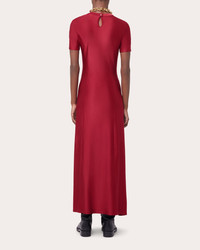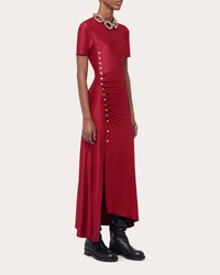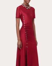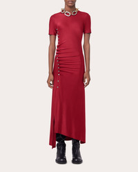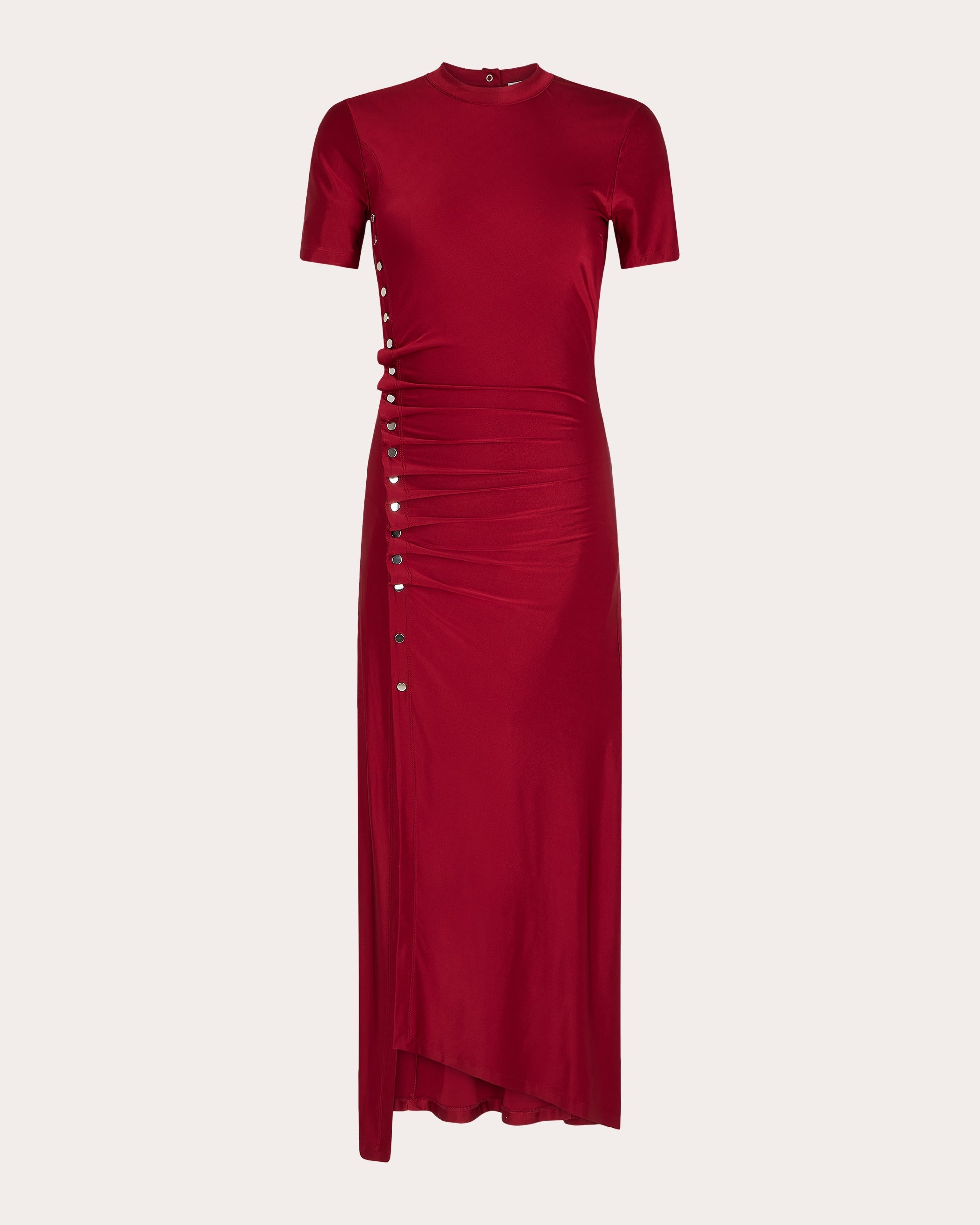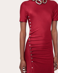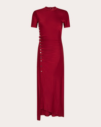 An iconic Rabanne midi, this short-sleeve dress decorates its jersey silhouette with silver-tone studs down one side for an asymmetric draped effect. Stretch-infused fabric and ruched detailing throughout the bodice create a universally flattering fit. Designer color name: Red Back keyhole button closure Silver-tone button embellishments Ruched bodice with side drape Asymmetric slit hem Jersey Self: 90% viscose, 10% elastane Dry clean Made in Portugal Size & Fit Garment measurements (size FR 34 / US 2): 48.03in long from center back neckline to hem, 25.98in bust, 27.24in waist, 38.58in hips Fits true to size. Designed for a close, slim fit. Mid-weight, stretchy fabric. Please note, below measurements reflect Rabanne's size chart, not the actual garment. Size FR 34 (US 2 / XS): 31.89in chest, 24.02in waist, 34.25in hips Size FR 36 (US 4 / S): 33.46in bust, 25.59in waist, 35.83in hips Size FR 38 (US 6 / M): 35.04in bust, 27.17in waist, 37.4in hips Size FR 40 (US 8 / L): 36.61in bust, 28.74in waist, 38.98in hips Size FR 42 (US 10 / XL): 38.19in bust, 30.31in waist, 40.55in hips Size FR 44 (US 12 / XXL): 39.76in bust, 31.89in waist, 42.13in hips
