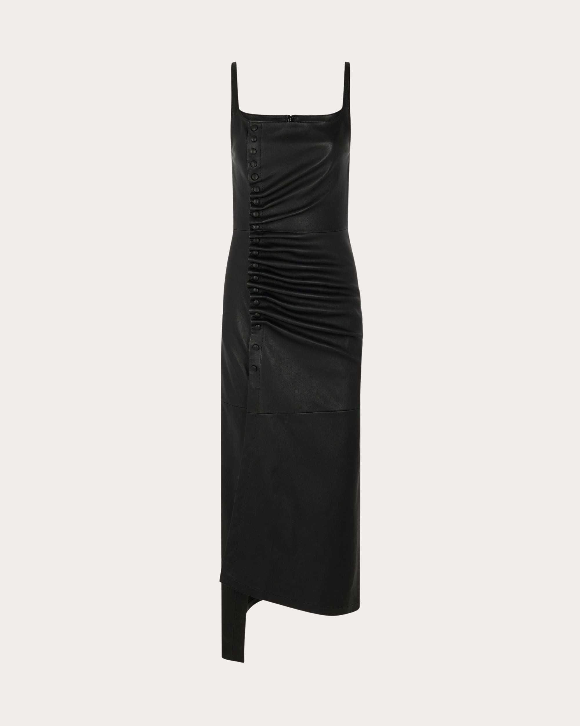 An iconic Rabanne silhouette, this sleeveless midi dress decorates its bodice with snap buttons down one side to create an asymmetric ruched effect. The genuine leather construction exudes a moto-chic aesthetic. Designer color: black Back-zip closure Snap button details (side) Ruched bodice Asymmetric hem Paneled Self: 100% leather Lining: 100% cotton Dey clean only Made in Turkey Size & Fit This style runs small. If you are in-between sizes, we recommend ordering one size up. Please note, below measurements reflect Rabanne's size chart, not the actual garment. Size FR 34 (US 2 / XS): 31.89in chest, 24.02in waist, 34.25in hips Size FR 36 (US 4 / S): 33.46in bust, 25.59in waist, 35.83in hips Size FR 38 (US 6 / M): 35.04in bust, 27.17in waist, 37.4in hips Size FR 40 (US 8 / L): 36.61in bust, 28.74in waist, 38.98in hips Size FR 42 (US 10 / XL): 38.19in bust, 30.31in waist, 40.55in hips Size FR 44 (US 12 / XXL): 39.76in bust, 31.89in waist, 42.13in hips
