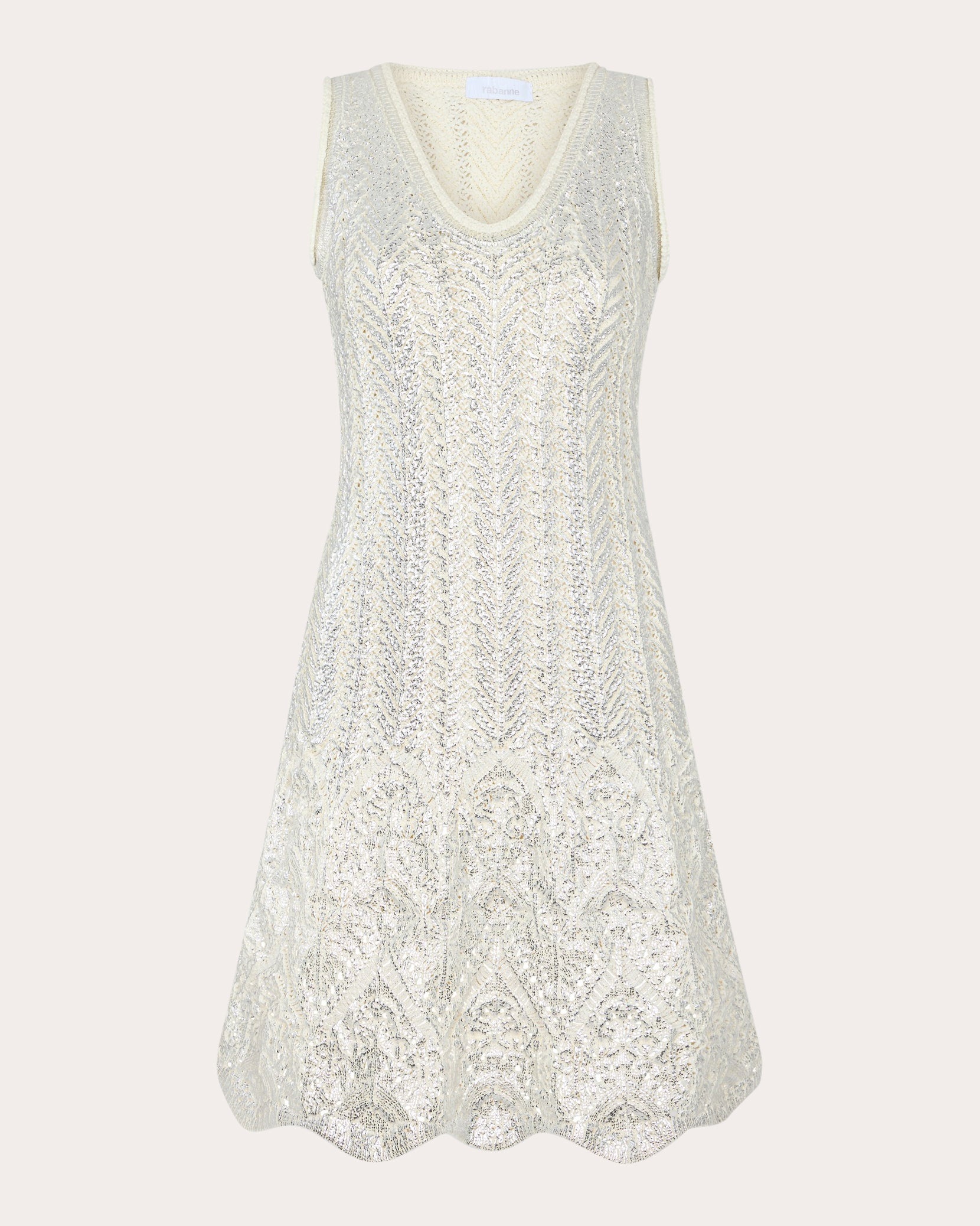 Left unlined for added dimension, this Rabanne dress is crafted from intricately crocheted cotton. Metallic silver threading throughout creates subtle shimmer. Designer color name: Ecru / Silver Pull-on Metallic crochet knit Unlined 80% cotton, 20% polyamide Dry clean Made in Italy Size & Fit Model (wearing size S): 5ft 11in tall True to size. Designed with a slightly slim fit. Lightweight knit. Please note, below measurements reflect Rabanne's size chart, not the actual garment. Size XS (FR 34 / US 2: 31.89in chest, 24.02in waist, 34.25in hips Size S (FR 36 / US 4): 33.46in bust, 25.59in waist, 35.83in hips Size M (FR 38 / US 6): 35.04in bust, 27.17in waist, 37.4in hips Size L (FR 40 / US 8): 36.61in bust, 28.74in waist, 38.98in hips Size XL (FR 42 / US 10: 38.19in bust, 30.31in waist, 40.55in hips Size XXL (FR 44 / US 12): 39.76in bust, 31.89in waist, 42.13in hips