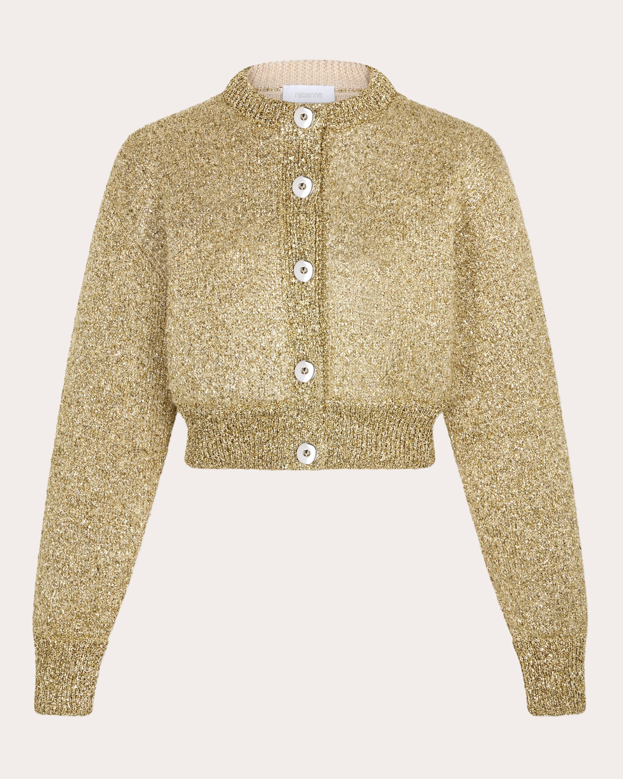 Spun from a golden metallic knit, this Rabanne cardigan finishes its button-front silhouette with contrast ribbed trim. Dropped shoulders and a cropped length emphasize casual styling. Button closure Dropped shoulders Cropped Contrast rib trim Metallic knit 65% virgin wool, 18% polyester, 17% metallic Dry clean Made in Italy Size & Fit Please note, below measurements reflect Rabanne's size chart, not the actual garment. Size XS (FR 34 / US 2: 31.89in chest, 24.02in waist, 34.25in hips Size S (FR 36 / US 4): 33.46in bust, 25.59in waist, 35.83in hips Size M (FR 38 / US 6): 35.04in bust, 27.17in waist, 37.4in hips Size L (FR 40 / US 8): 36.61in bust, 28.74in waist, 38.98in hips Size XL (FR 42 / US 10: 38.19in bust, 30.31in waist, 40.55in hips Size XXL (FR 44 / US 12): 39.76in bust, 31.89in waist, 42.13in hips