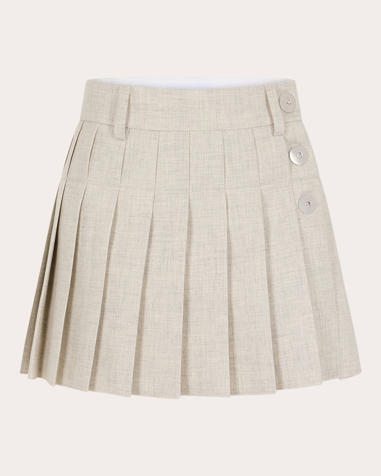 Rooted in traditional tailoring, this Rabanne mini skirt is crafted from a mottled wool-cotton blend. Pleated details create dimensional shape. Designer color name: Beige Button closure Darted back waist Pleated details Self: 50% cotton, 50% wool Lining: 100% viscose Dry clean Made in Morocco Size & Fit Model (wearing size FR 36 / US 4): 5ft 11in tall True to size. Designed to be worn on the hip. Mid-weight, non-stretchy fabric. Please note, below measurements reflect Rabanne's size chart, not the actual garment. Size FR 34 (US 2 / XS): 31.89in chest, 24.02in waist, 34.25in hips Size FR 36 (US 4 / S): 33.46in bust, 25.59in waist, 35.83in hips Size FR 38 (US 6 / M): 35.04in bust, 27.17in waist, 37.4in hips Size FR 40 (US 8 / L): 36.61in bust, 28.74in waist, 38.98in hips Size FR 42 (US 10 / XL): 38.19in bust, 30.31in waist, 40.55in hips Size FR 44 (US 12 / XXL): 39.76in bust, 31.89in waist, 42.13in hips