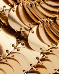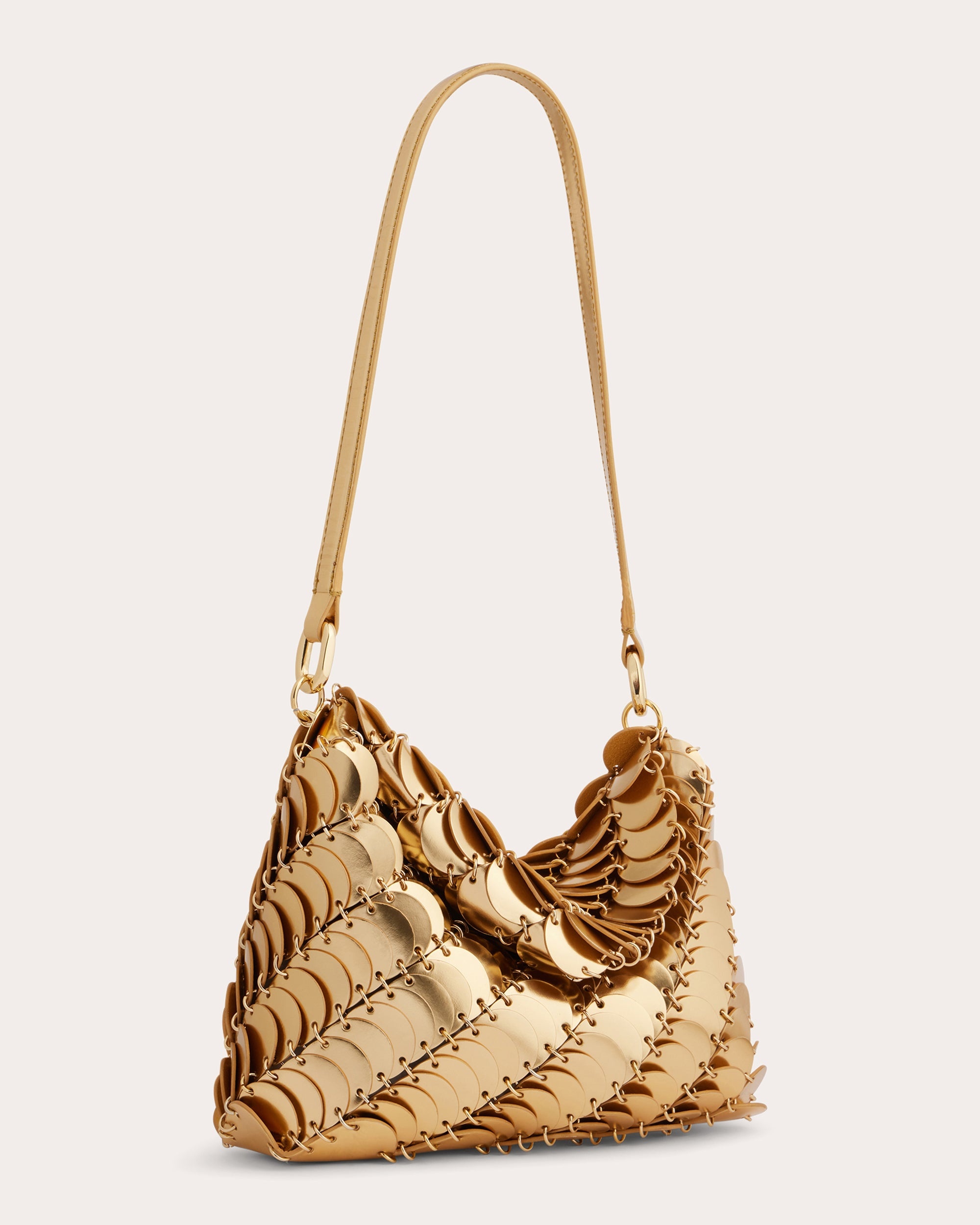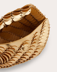A reinvention of the iconic line of Paco bags, this pliable piece is comprised of the brand's signature metallic leather discs bonded together by smaller metal rings. Anchored by a gold chain link strap, the silhouette features a fold-over closure for easy interior access. Designer color name: Gold Fold-over closure Chain link strap Metallic leather discs Metal ring bonding Gold-tone finish Outer: 80% leather, 10% steel, 5% aluminum, 5% brass Spot clean Made in Hungary Measurements Width: 11.22in Height: 6.69in Depth: 1.18in