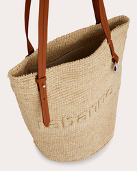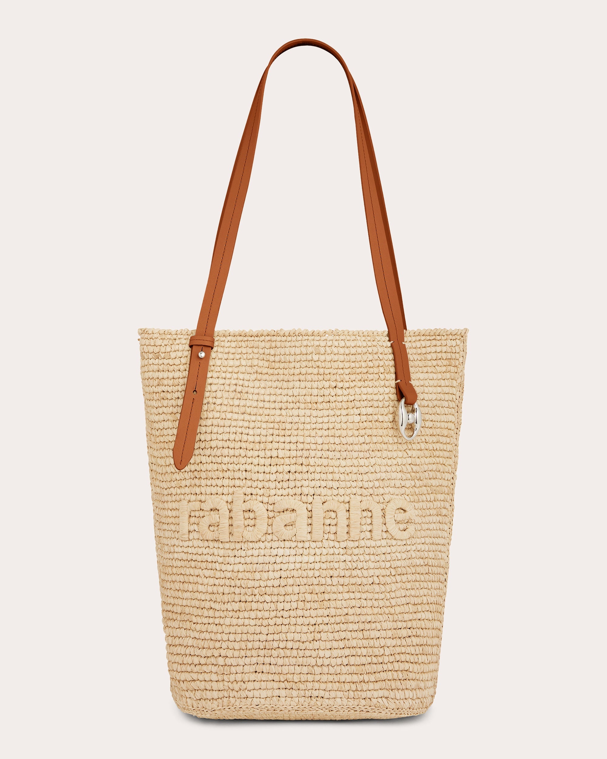 Anchored by adjustable leather straps, this generously sized tote is woven from neutral-hued raffia for a bohemian feel. A tonal logo and signature '8' link embellishment give nod to the core identity of Rabanne. Designer color name: Shiny Beige Adjustable handles Silver-tone hardware Signature '8' link embellishment (strap base) Tonal logo Interior slip pocket Woven raffia 95% raffia, 5% leather Spot clean Made in Madagascar Measurements Width: 14.56in Height: 14.56in Depth: 9.05in