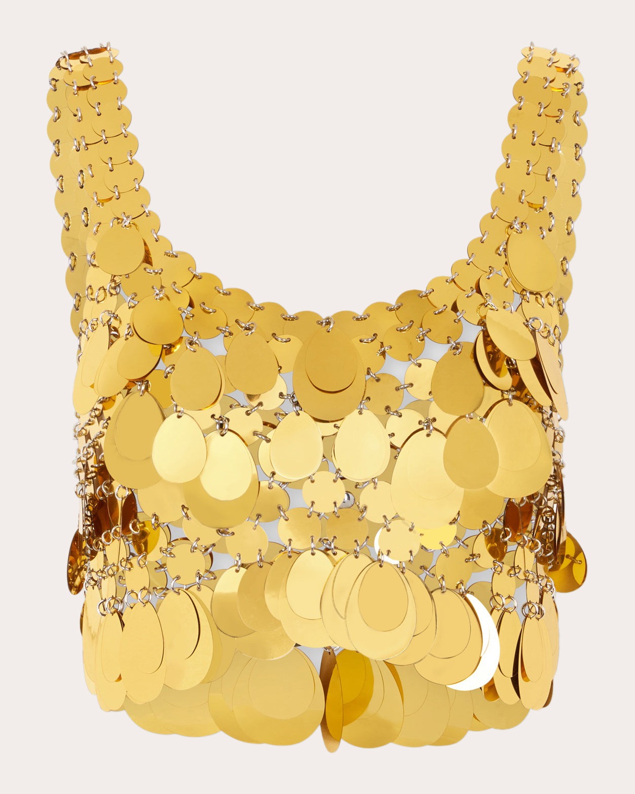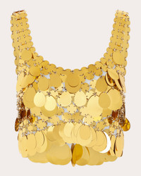 A nod to Rabanne's inaugural collections, this futuristic crop top is comprised of mirrored golden discs connected by smaller metal rings. Pair with the Sparkle Discs Mini Skirt in Gold for statement styling. Designer color name: Gold Gold sparkle discs Gold-tone metal ring bonding Cropped hem 90% polyester, 10% steel Do not wash Made in Madagascar Size & Fit Size FR 34 (US 2 / XS): 31.89in chest, 24.02in waist, 34.25in hips Size FR 36 (US 4 / S): 33.46in bust, 25.59in waist, 35.83in hips Size FR 38 (US 6 / M): 35.04in bust, 27.17in waist, 37.4in hips Size FR 40 (US 8 / L): 36.61in bust, 28.74in waist, 38.98in hips Size FR 42 (US 10 / XL): 38.19in bust, 30.31in waist, 40.55in hips Size FR 44 (US 12 / XXL): 39.76in bust, 31.89in waist, 42.13in hips Please note, above measurements reflect Rabanne's size chart, not the actual garment.
