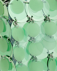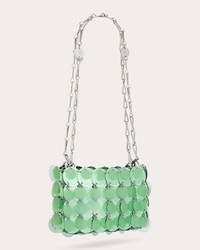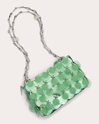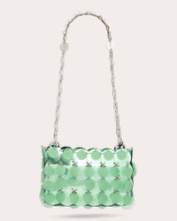 A nod to Rabanne's iconic, inaugural aesthetic, this bite-sized bag is comprised of layered aqua discs bonded together by smaller metal rings. The silver chain link straps are decorated with engraved monogram medallions for a signature finishing touch. Designer color name: Aqua Green/Silver Magnetic closure Chain link straps Engraved monogram medallions (straps) Paillette discs Metal ring bonding Silver-tone finish 90% polyester, 10% steel Spot clean Made in Madagascar Measurements Width: 6.69in Height: 4.33in Depth: 1.18in