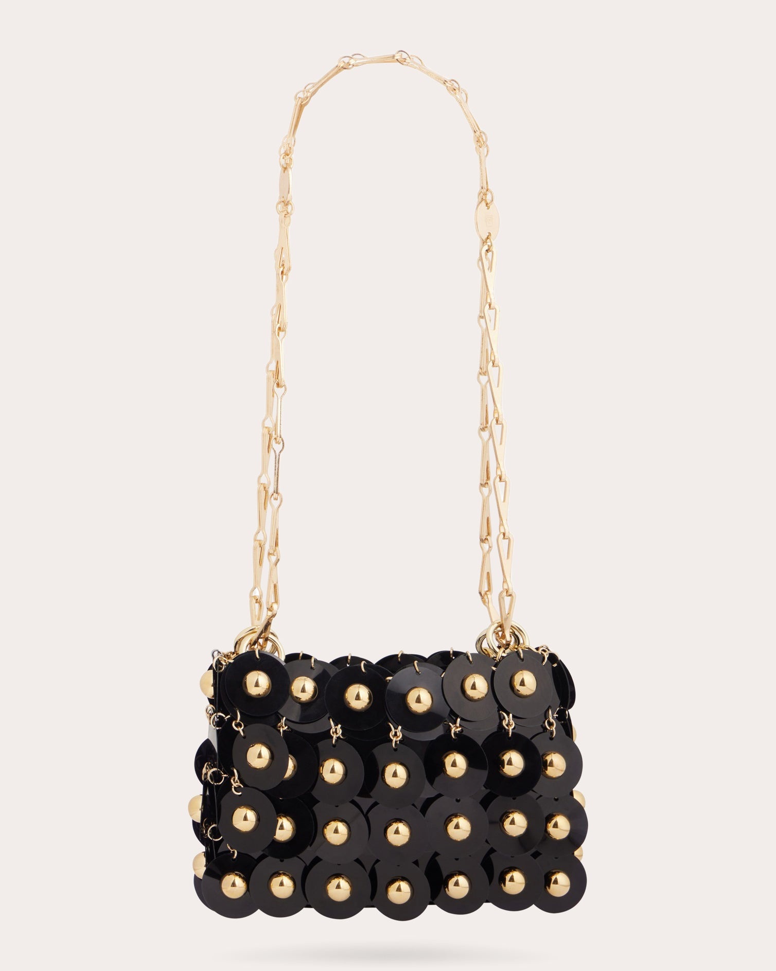 A nod to Rabanne's iconic, inaugural aesthetic, this pliable bag is comprised of mirrored black discs bonded together by smaller metal rings. Gold-tone hardware and spherical stud embellishments create elevated appeal. Designer color name: Black/Gold Detachable chain strap Gold-tone hardware Spherical stud embellishments Mirrored black discs Metal ring bonding Engraved monogram detail (strap hardware) 60% polyester, 20% steel, 20% brass Clean with soft cloth Made in Madagascar Measurements Width: 6.69in Height: 4.33in Depth: 1.18in