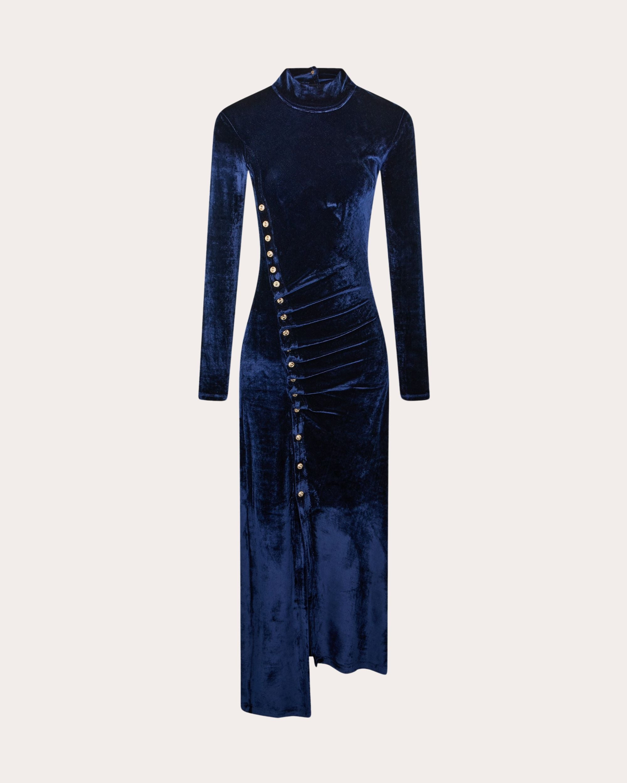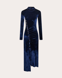 An iconic Rabanne silhouette, this mock neck midi dress decorates its bodice with snap buttons down one side to create an asymmetric ruched effect. The stretch velvet fabric hugs the figure for flattering shape. Designer color: navy Poseidon Back keyhole button closure Mock neck collar Snap button details Ruched bodice Asymmetric hem Velvet 77% viscose, 21% polyamide, 2% elastane Dry clean Made in Portugal Size & Fit This style runs small. If you are in-between sizes, we recommend ordering one size up. Please note, below measurements reflect Rabanne's size chart, not the actual garment. Size FR 34 (US 2 / XS): 31.89in chest, 24.02in waist, 34.25in hips Size FR 36 (US 4 / S): 33.46in bust, 25.59in waist, 35.83in hips Size FR 38 (US 6 / M): 35.04in bust, 27.17in waist, 37.4in hips Size FR 40 (US 8 / L): 36.61in bust, 28.74in waist, 38.98in hips Size FR 42 (US 10 / XL): 38.19in bust, 30.31in waist, 40.55in hips Size FR 44 (US 12 / XXL): 39.76in bust, 31.89in waist, 42.13in hips