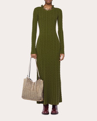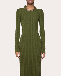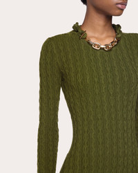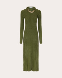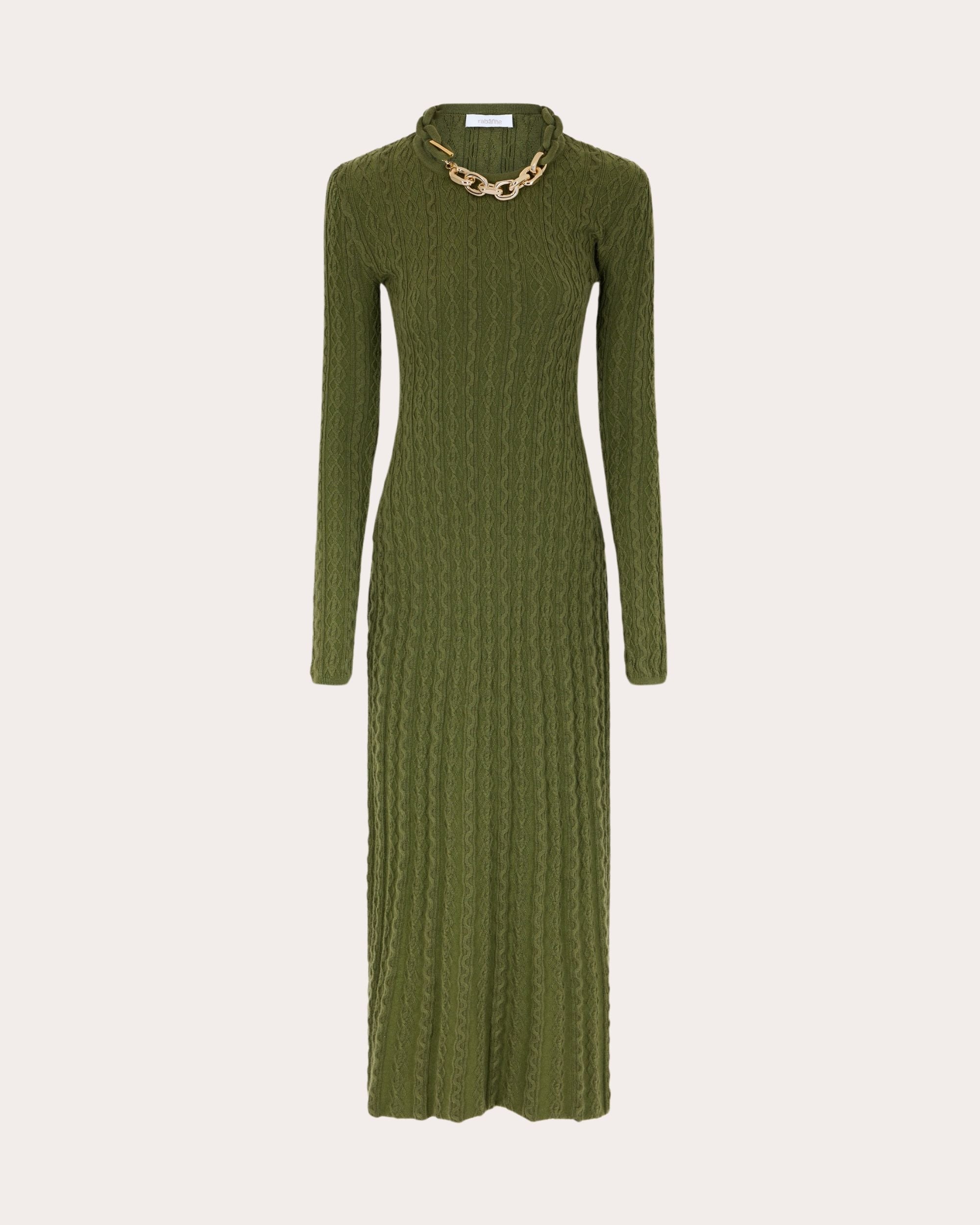 The epitome of luxury knitwear, this sweater dress decorates its wool-cashmere silhouette with classic cable motifs. A goldtone chain along the collar exudes signature Rabanne design. Designer color: khaki Pull-on Goldtone chain link collar Cable knit 90% wool, 10% cashmere Dry clean Made in China Size & Fit Fits true to size Please note, below measurements reflect Rabanne's size chart, not the actual garment. Size XS (FR 34 / US 2: 31.89in chest, 24.02in waist, 34.25in hips Size S (FR 36 / US 4): 33.46in bust, 25.59in waist, 35.83in hips Size M (FR 38 / US 6): 35.04in bust, 27.17in waist, 37.4in hips Size L (FR 40 / US 8): 36.61in bust, 28.74in waist, 38.98in hips Size XL (FR 42 / US 10: 38.19in bust, 30.31in waist, 40.55in hips Size XXL (FR 44 / US 12): 39.76in bust, 31.89in waist, 42.13in hips