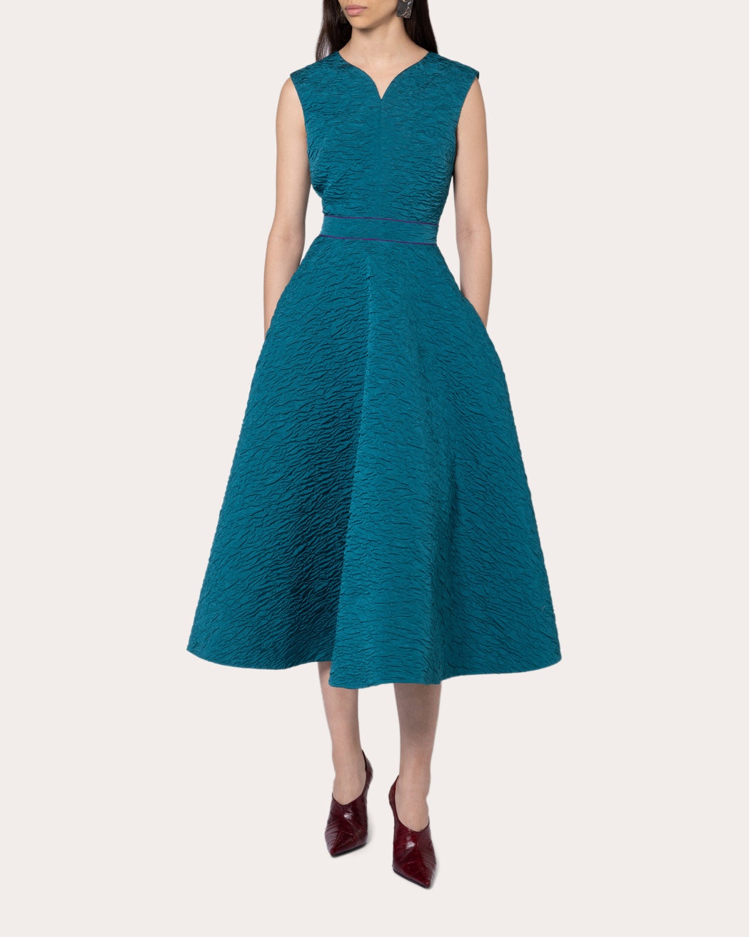 Crafted from textured cloque, the Ridha dress pairs its notched neckline with a signature sculpturally cut back. Fitted at the waist, the flared skirt creates dimensional shape. Designer color: Persian green Back-zip closure Notched neckline Fitted waist Side pockets Textured cloque Self: 100% polyester Lining: 73% acetate, 27% silk Dry clean Made in China Size & Fit True to size. Designed to be fitted at bust and waist, loose in the hip. Mid-weight, non-stretchy fabric. Please note, below measurements reflect Roksanda's size chart, not the actual garment. Size UK 6 (US 0-2 / XS): 33.07in bust; 25.2in waist; 35.43in low hip; 24.31in arm length Size UK 8 (US 4 / S): 33.86in bust; 25.98in waist; 36.22in low hip; 24.41in arm length Size UK 10 (US 6 / S/M): 35.43in bust; 27.56in waist; 37.8in low hip; 24.76in arm length Size UK 12 (US 8 / M): 37.4in bust; 29.53in waist; 39.76in low hip; 24.76in arm length Size UK 14 (US 10 / M/L): 39.37in bust; 31.5in waist; 41.73in low hip; 24.96in arm length Size UK 16 (US 12 / L): 41.34in bust; 33.46in waist; 43.7in low hip; 25.16in arm length