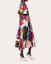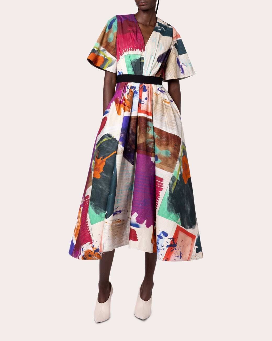 Dreamt up in abstractly printed cotton, Roksanda's Sana dress pairs its V-neck bodice with a circular midi skirt to create a dramatic fit-and-flare silhouette. The wide sleeves and belted waistline embrace structured shape. Designer color: Chalk pictorial print Back-zip closure Structured sleeves Fitted waist with tied belt Gathered skirt pleats Side pockets Self: 100% cotton Lining: 100% cotton Dry clean Made in China Size & Fit Please note, below measurements reflect Roksanda's size chart, not the actual garment. Size UK 6 (US 0-2 / XS): 33.07in bust; 25.2in waist; 35.43in low hip; 24.31in arm length Size UK 8 (US 4 / S): 33.86in bust; 25.98in waist; 36.22in low hip; 24.41in arm length Size UK 10 (US 6 / S/M): 35.43in bust; 27.56in waist; 37.8in low hip; 24.76in arm length Size UK 12 (US 8 / M): 37.4in bust; 29.53in waist; 39.76in low hip; 24.76in arm length Size UK 14 (US 10 / M/L): 39.37in bust; 31.5in waist; 41.73in low hip; 24.96in arm length Size UK 16 (US 12 / L): 41.34in bust; 33.46in waist; 43.7in low hip; 25.16in arm length