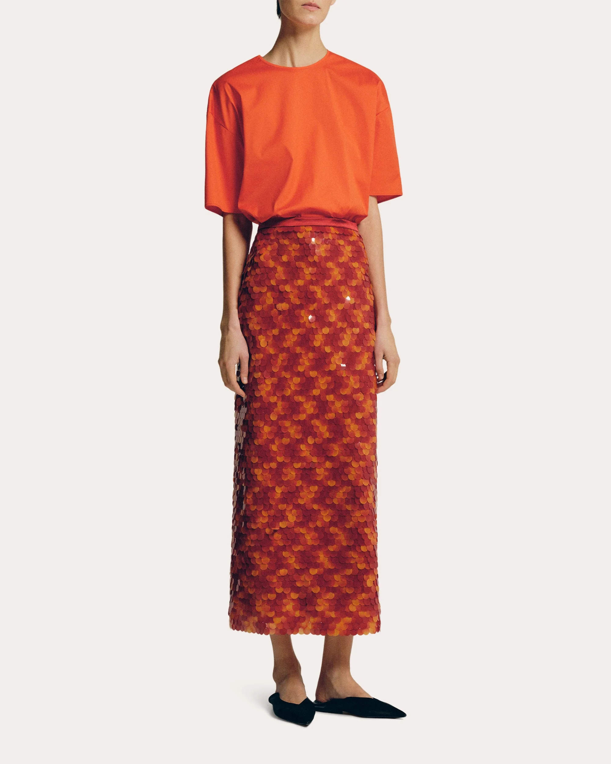 Cast in a vibrant orange hue, this crewneck T-shirt is crafted from crisp cotton poplin. The dropped shoulders and boxy bodice emphasize a relaxed fit. Designer color name: Orange Back clasp closure Dropped shoulders Boxy silhouette Crisp poplin 74% cotton, 21% polyamide, 5% elastane Dry clean Made in Spain Size & Fit Please note, below measurements reflect Sophie et Viola's size chart, not the actual garment. Size XS (US 2): 31.49in bust, 23.62in waist, 34.64in hips Size S (US 4): 33.07in bust, 25.19in waist, 36.22in hips Size M (US 6): 34.64in bust, 26.77in waist, 37.79in hips Size L (US 8): 36.22in bust, 28.5in waist, 39.37in hips Size XL (US 10): 37.79in bust, 30.23in waist, 40.94in hips
