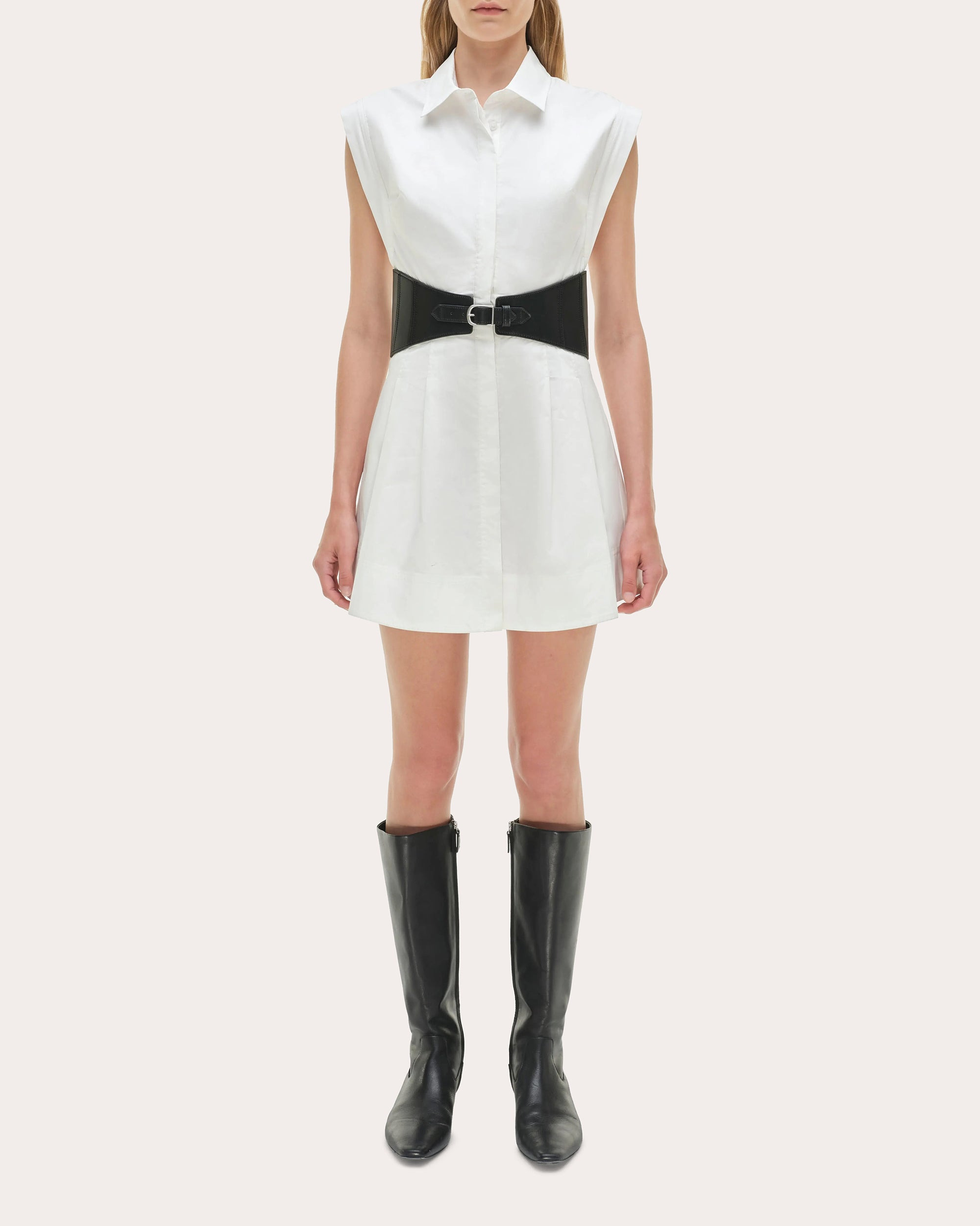 Cut from crisp cotton poplin, the Adler dress tailors its sleeveless shirt silhouette with a collared neckline, functional front buttons and inverted skirt pleats. The buckled belt creates a cinched waist shape. Designer color: white Front button closure Collared neckline Buckled waist belt Inverted skirt pleats Poplin Self: 63% cotton, 37% polyester Lining: 100% cotton Dry clean only Made in China Size & Fit Model (wearing size S): 5ft 10in tall Fits true to size Please note, below measurements reflect SIMKHAI's size chart, not the actual garment. Size XS (US 0-2): 32-33in bust, 25-26in natural waist, 35.5-36.5in low hip Size S (US 4-6): 34-35.25in bust, 27-28.25in natural waist, 37.5-38.75in low hip Size M (US 8-10): 36.5-38in bust, 29.5-31in natural waist, 40-41.5in low hip Size L (US 12): 39.5in bust, 32.5in natural waist, 43in low hip
