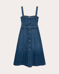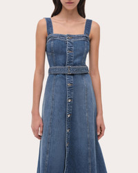 Crafted from stretch cotton denim, SIMKHAI's Alba dress creates flattering shape with its bustier bodice, belted waistline and A-line midi skirt. Metal hardware and topstitched seams give nod to classic blue jean design. Front button closure Fitted bustier bodice Belted waistline Topstitched seams Front-slit hem Denim 98% cotton, 2% elastane Machine wash cold, dry flat Made in the USA Size & Fit Model (wearing size US 2): 5ft 10in tall True to size. Designed to be fitted at bust and waist, loose in the hip. Mid-weight, slightly-stretchy fabric. Please note, below measurements reflect SIMKHAI's size chart, not the actual garment. Size US 0: 32in bust, 25in natural waist, 35.5in low hip Size US 2: 33in bust, 26in natural waist, 36.5in low hip Size US 4: 34in bust, 27in natural waist, 37.5in low hip Size US 6: 35.25in bust, 28.25in natural waist, 38.75in low hip Size US 8: 36.5in bust, 29.5in natural waist, 40in low hip Size US 10: 38in bust, 31in natural waist, 41.5in low hip Size US 12: 39.5in bust, 32.5in natural waist, 43in low hip