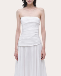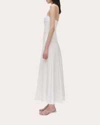 A display of tonal dimension, SIMKHAI's Arie dress pairs its ruched bustier bodice with a pleated poplin skirt. The strapless midi is tailored with a bias-cut waistline for enhanced shape. Side-zip closure Strapless neckline Ruched bustier bodice Bias-cut waistline Pleated skirt Poplin Self: 63% cotton, 37% polyester Lining: 100% cotton Machine wash cold, dry flat Made in China Size & Fit Model (wearing size US 2): 5ft 10in tall True to size. Designed to be fitted at bust and waist, loose in the hip. Mid-weight, non-stretchy fabric. Please note, below measurements reflect SIMKHAI's size chart, not the actual garment. Size US 0: 32in bust, 25in natural waist, 35.5in low hip Size US 2: 33in bust, 26in natural waist, 36.5in low hip Size US 4: 34in bust, 27in natural waist, 37.5in low hip Size US 6: 35.25in bust, 28.25in natural waist, 38.75in low hip Size US 8: 36.5in bust, 29.5in natural waist, 40in low hip Size US 10: 38in bust, 31in natural waist, 41.5in low hip Size US 12: 39.5in bust, 32.5in natural waist, 43in low hip
