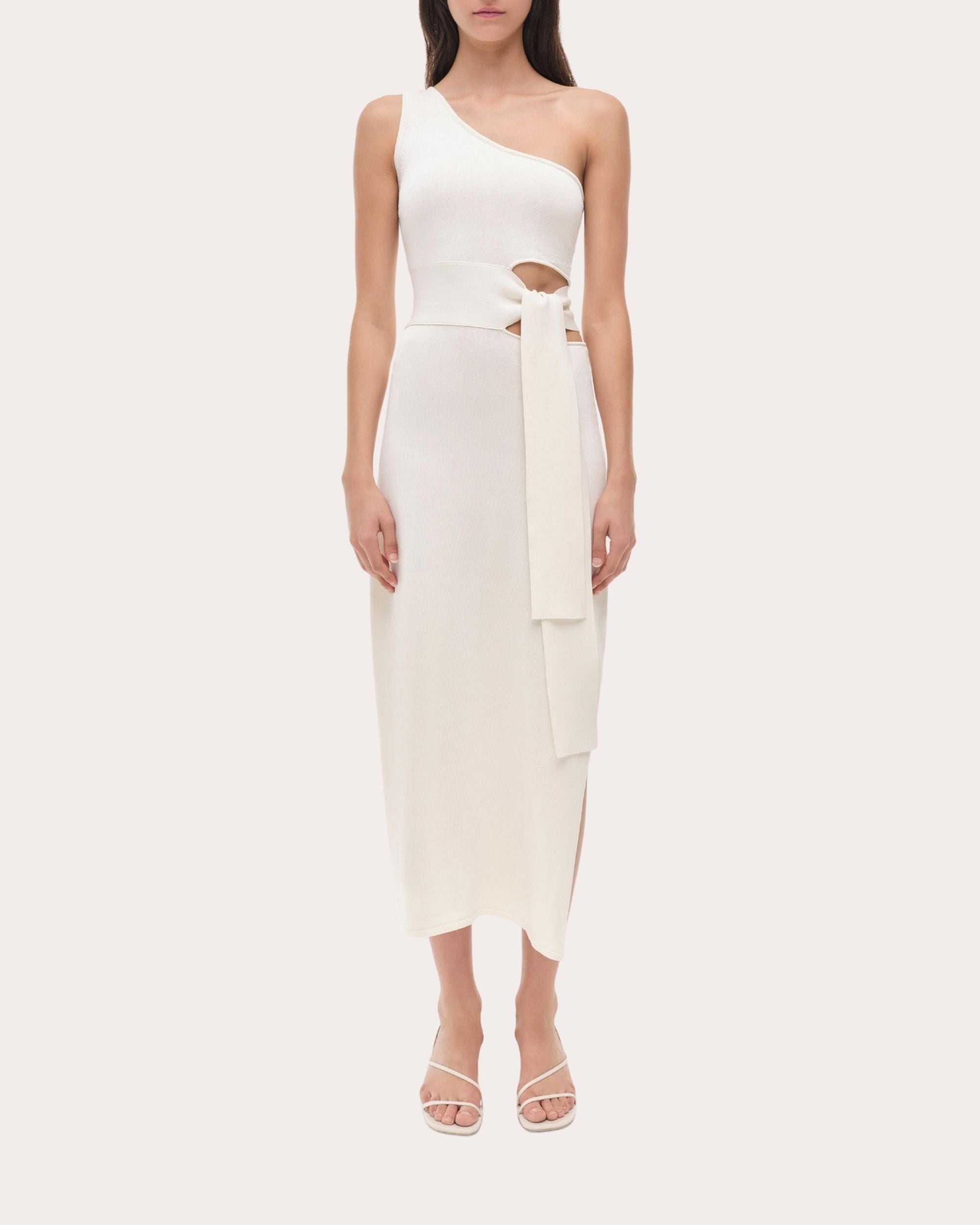 Knit from a compact cotton-silk blend, SIMKHAI's Aurelia dress embraces asymmetric form with its one-shoulder neckline and side cutout detail. A fixed tie at the waist creates flattering shape. Pull-on Asymmetric neckline Fixed waist tie Side cutout detail Side-slit hem Knit 70% cotton, 30% silk Dry clean Made in China Size & Fit True to size. Designed for a slim fit through the bust, waist and hips. Mid-weight knit. Please note, below measurements reflect SIMKHAI's size chart, not the actual garment. Size XS (US 0-2): 32-33in bust, 25-26in natural waist, 35.5-36.5in low hip Size S (US 4-6): 34-35.25in bust, 27-28.25in natural waist, 37.5-38.75in low hip Size M (US 8-10): 36.5-38in bust, 29.5-31in natural waist, 40-41.5in low hip Size L (US 12): 39.5in bust, 32.5in natural waist, 43in low hip