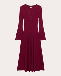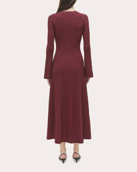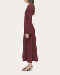 Spun from a compact rib knit, the Genna dress fits slim throughout the bodice before flaring gently at the hem. Banded trim along the notched neckline creates a clean-cut finish. Designer color: cranberry Pull-on Notched V-neckline Flared sleeves and hem Compact rib knit 83% rayon, 17% polyester Dry clean only Made in China Size & Fit Model (wearing size S): 5ft 10in tall Fits true to size Please note, below measurements reflect SIMKHAI's size chart, not the actual garment. Size XS (US 0-2): 32-33in bust, 25-26in natural waist, 35.5-36.5in low hip Size S (US 4-6): 34-35.25in bust, 27-28.25in natural waist, 37.5-38.75in low hip Size M (US 8-10): 36.5-38in bust, 29.5-31in natural waist, 40-41.5in low hip Size L (US 12): 39.5in bust, 32.5in natural waist, 43in low hip
