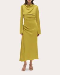 Dreamt up in lustrous satin, the Odessa dress embraces fluid dimension with its draped neckline and strategically gathered bodice. Bias-cut seams and a slit at the hem enhance the skirt's flowing shape. Designer color: pear Side zip and back button closure Draped neckline Gathered details Bias-cut skirt seam Side-slit hem Satin Self: 84% acetate, 16% polyester Lining: 100% polyester Dry clean only Made in China Size & Fit Model (wearing size US 2): 5ft 10in tall Fits true to size Please note, below measurements reflect SIMKHAI's size chart, not the actual garment. Size US 0: 32in bust, 25in natural waist, 35.5in low hip Size US 2: 33in bust, 26in natural waist, 36.5in low hip Size US 4: 34in bust, 27in natural waist, 37.5in low hip Size US 6: 35.25in bust, 28.25in natural waist, 38.75in low hip Size US 8: 36.5in bust, 29.5in natural waist, 40in low hip Size US 10: 38in bust, 31in natural waist, 41.5in low hip Size US 12: 39.5in bust, 32.5in natural waist, 43in low hip