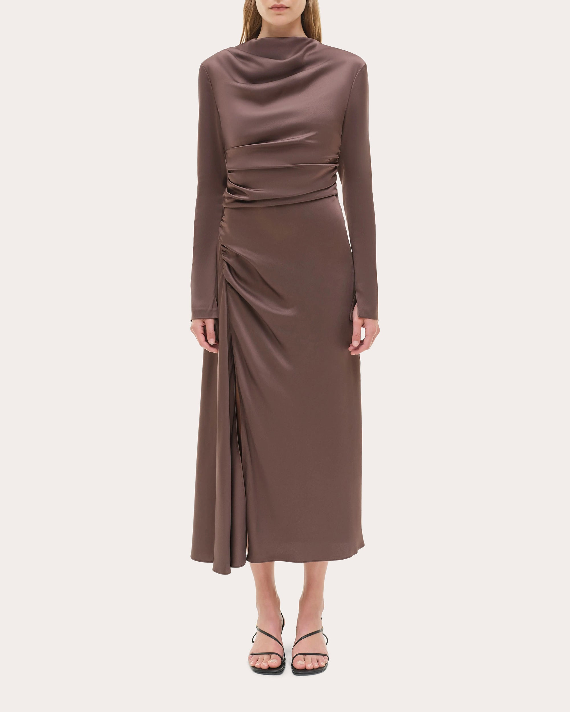 Dreamt up in lustrous satin, the Odessa dress embraces fluid dimension with its draped neckline and strategically gathered bodice. Bias-cut seams and a slit at the hem enhance the skirt's flowing shape. Designer color: chocolate Side zip and back button closure Draped neckline Gathered details Bias-cut skirt seam Side-slit hem Satin Self: 84% acetate, 16% polyester Lining: 100% polyester Dry clean only Made in China Size & Fit Model (wearing size US 2): 5ft 10in tall Fits true to size Please note, below measurements reflect SIMKHAI's size chart, not the actual garment. Size US 0: 32in bust, 25in natural waist, 35.5in low hip Size US 2: 33in bust, 26in natural waist, 36.5in low hip Size US 4: 34in bust, 27in natural waist, 37.5in low hip Size US 6: 35.25in bust, 28.25in natural waist, 38.75in low hip Size US 8: 36.5in bust, 29.5in natural waist, 40in low hip Size US 10: 38in bust, 31in natural waist, 41.5in low hip Size US 12: 39.5in bust, 32.5in natural waist, 43in low hip