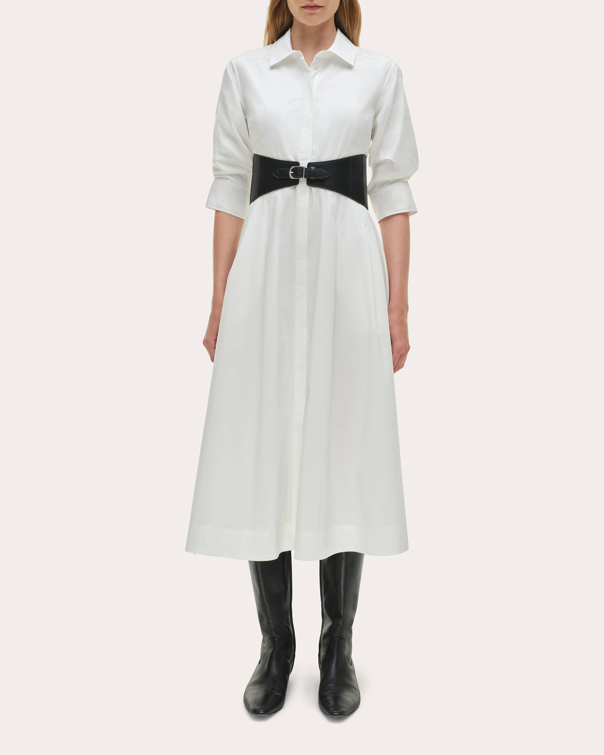 Cut from crisp cotton poplin, the Olson dress adds dimension to its collared shirt silhouette with gathered sleeves and inverted skirt pleats. The buckled belt creates a cinched waist shape. Designer color: white Button closure Collared neckline Buckled waist belt Inverted skirt pleats Gathered elbow sleeves Button sleeve cuffs Poplin Self: 63% cotton, 37% polyester Lining: 100% cotton Dry clean only Made in China Size & Fit Model (wearing size S): 5ft 10in tall Fits true to size Please note, below measurements reflect SIMKHAI's size chart, not the actual garment. Size XS (US 0-2): 32-33in bust, 25-26in natural waist, 35.5-36.5in low hip Size S (US 4-6): 34-35.25in bust, 27-28.25in natural waist, 37.5-38.75in low hip Size M (US 8-10): 36.5-38in bust, 29.5-31in natural waist, 40-41.5in low hip Size L (US 12): 39.5in bust, 32.5in natural waist, 43in low hip