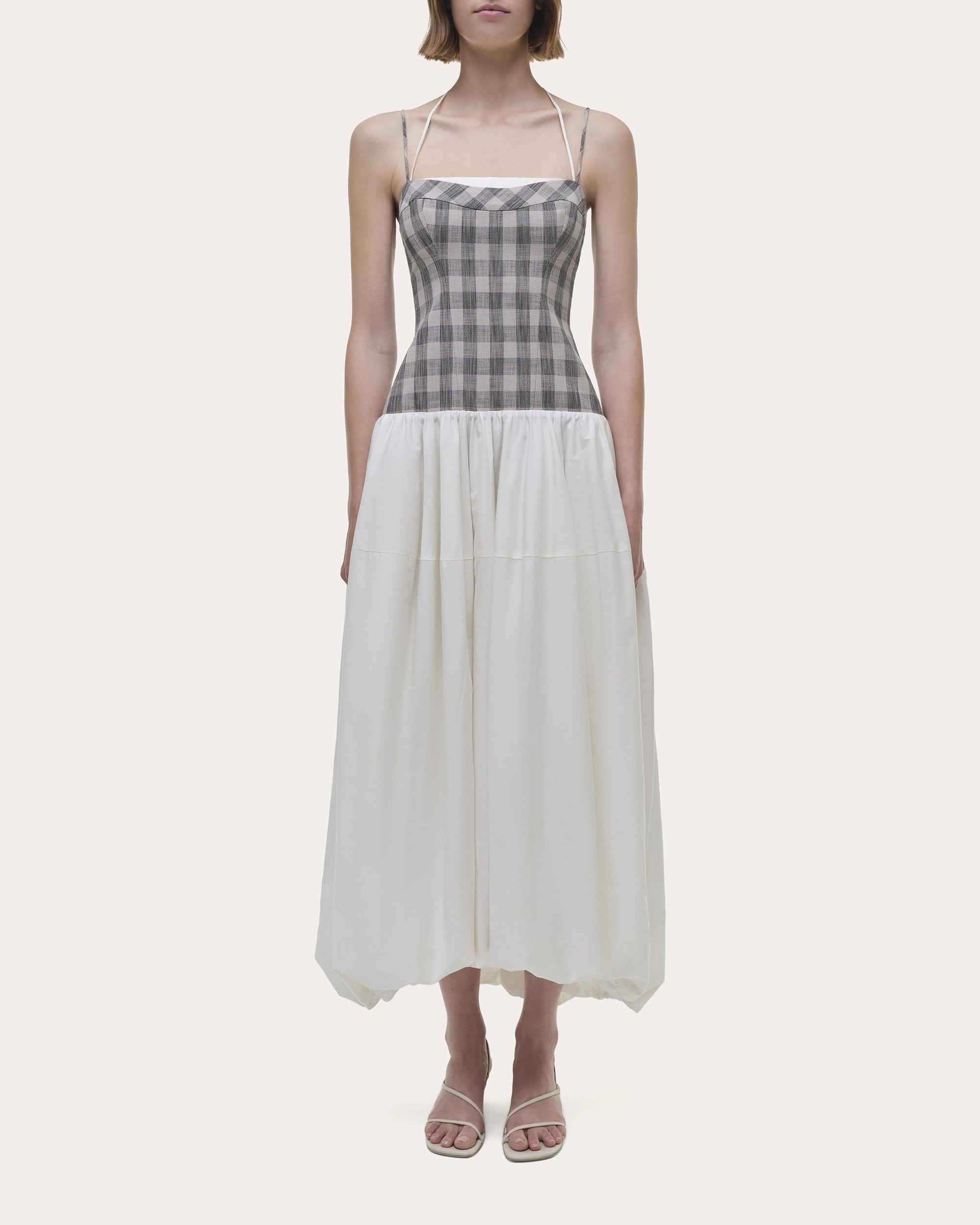 A striking balance of structure and movement, the Pfeiffer dress pairs its gingham-print bustier bodice with a voluminous bubble-hem skirt. Designed to create a faux-layered illusion, the bust is supported by both halter and shoulder straps. Back-zip closure Halter tie neckline Adjustable shoulder straps Faux layered bust Fitted bustier bodice Gathered drop-waist seam Bubble hem Self: 75% viscose, 23% polyester, 2% elastane Combo: 100% cotton Lining: 100% polyurethane Dry clean Made in China Size & Fit Model (wearing size US 2): 5ft 10in tall Fits true to size Please note, below measurements reflect SIMKHAI's size chart, not the actual garment. Size US 0: 32in bust, 25in natural waist, 35.5in low hip Size US 2: 33in bust, 26in natural waist, 36.5in low hip Size US 4: 34in bust, 27in natural waist, 37.5in low hip Size US 6: 35.25in bust, 28.25in natural waist, 38.75in low hip Size US 8: 36.5in bust, 29.5in natural waist, 40in low hip Size US 10: 38in bust, 31in natural waist, 41.5in low hip Size US 12: 39.5in bust, 32.5in natural waist, 43in low hip