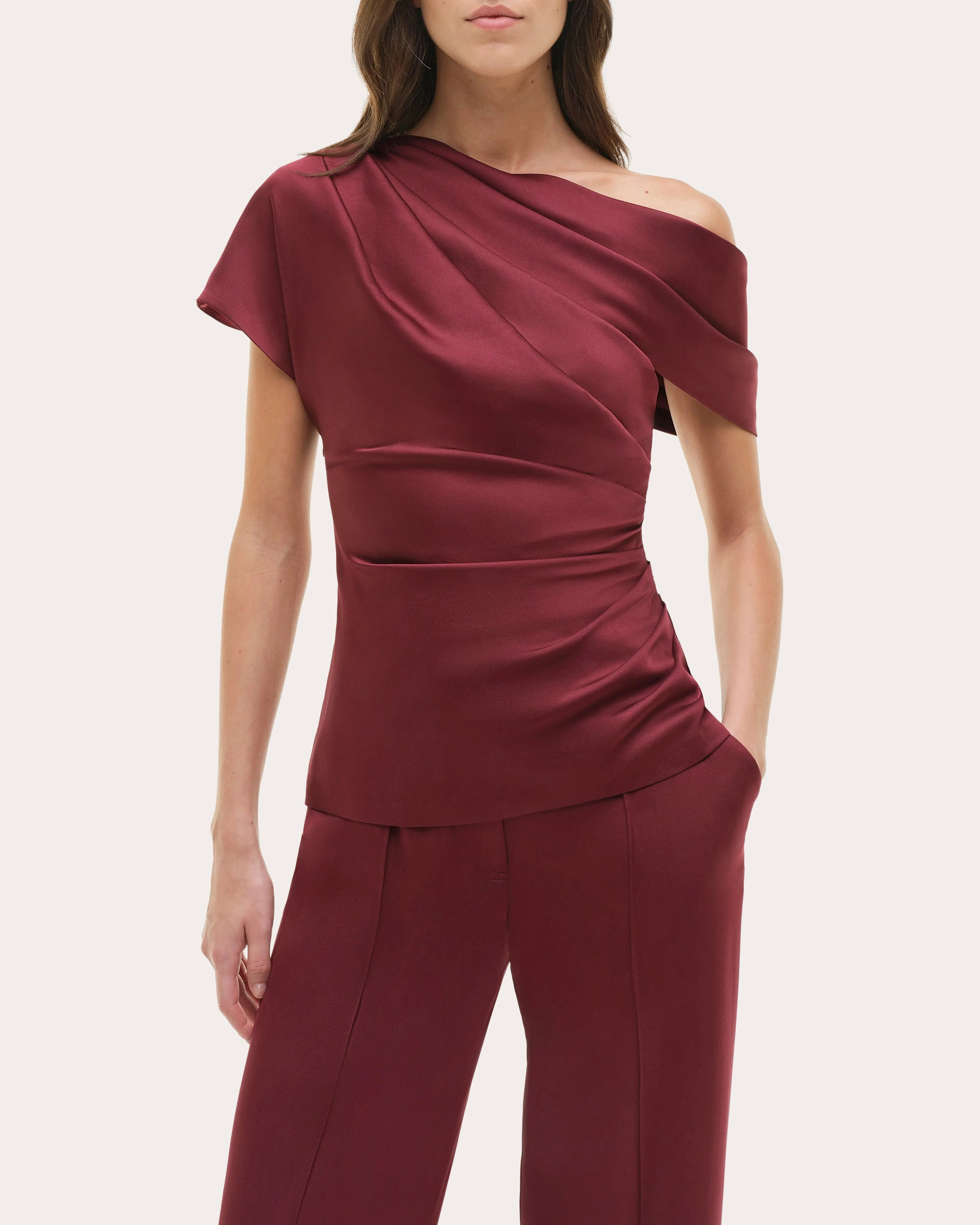 Dreamt up in cranberry red satin, the Phoebe top embraces asymmetric design with its slanted off-shoulder neckline. Strategic gathering at the side creates dimensionally flattering shape. Designer color: cranberry Side-zip closure Asymmetric off-shoulder neckline Gathered draping Fitted waist Satin Self: 84% acetate, 16% polyester Lining: 100% polyester Dry clean only Made in China Size & Fit Model (wearing size US 2): 5ft 10in tall Fits true to size Please note, below measurements reflect SIMKHAI's size chart, not the actual garment. Size US 0: 32in bust, 25in natural waist, 35.5in low hip Size US 2: 33in bust, 26in natural waist, 36.5in low hip Size US 4: 34in bust, 27in natural waist, 37.5in low hip Size US 6: 35.25in bust, 28.25in natural waist, 38.75in low hip Size US 8: 36.5in bust, 29.5in natural waist, 40in low hip Size US 10: 38in bust, 31in natural waist, 41.5in low hip Size US 12: 39.5in bust, 32.5in natural waist, 43in low hip