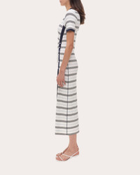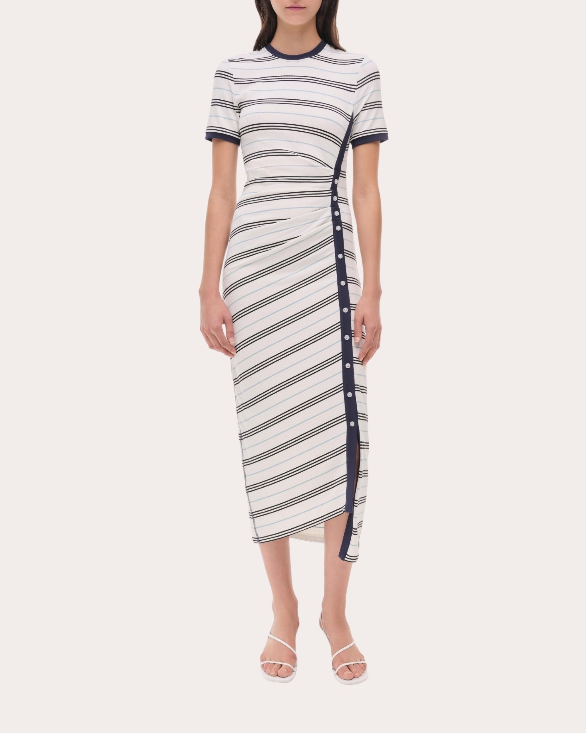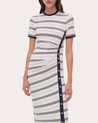 Rooted in T-shirt inspiration, SIMKHAI's Shanna dress is brought to life in a striped rib knit. The silhouette's side button placket is tailored with gathered ruching to create an asymmetric draped effect. Pull-on Side button placket Gathered ruching Asymmetric hem Ribbed knit Self: 90% rayon, 10% elastane Hand wash cold, dry flat Made in China Size & Fit True to size. Designed for a slim fit through the bust, waist and hips. Mid-weight knit. Please note, below measurements reflect SIMKHAI's size chart, not the actual garment. Size XS (US 0-2): 32-33in bust, 25-26in natural waist, 35.5-36.5in low hip Size S (US 4-6): 34-35.25in bust, 27-28.25in natural waist, 37.5-38.75in low hip Size M (US 8-10): 36.5-38in bust, 29.5-31in natural waist, 40-41.5in low hip Size L (US 12): 39.5in bust, 32.5in natural waist, 43in low hip