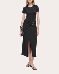 SIMKHAI's take on the staple T-shirt dress, the Soren midi is shaped with a gathered wrap design at the waist. Hammered gold hardware creates an organic focal point. Designer color: black Pull-on Gathered waist wrap Hammered gold ring hardware Overlapped skirt Knit 71% viscose, 29% nylon Dry clean only Made in China Size & Fit Model (wearing size S): 5ft 10in tall Fits true to size Please note, below measurements reflect SIMKHAI's size chart, not the actual garment. Size XS (US 0-2): 32-33in bust, 25-26in natural waist, 35.5-36.5in low hip Size S (US 4-6): 34-35.25in bust, 27-28.25in natural waist, 37.5-38.75in low hip Size M (US 8-10): 36.5-38in bust, 29.5-31in natural waist, 40-41.5in low hip Size L (US 12): 39.5in bust, 32.5in natural waist, 43in low hip