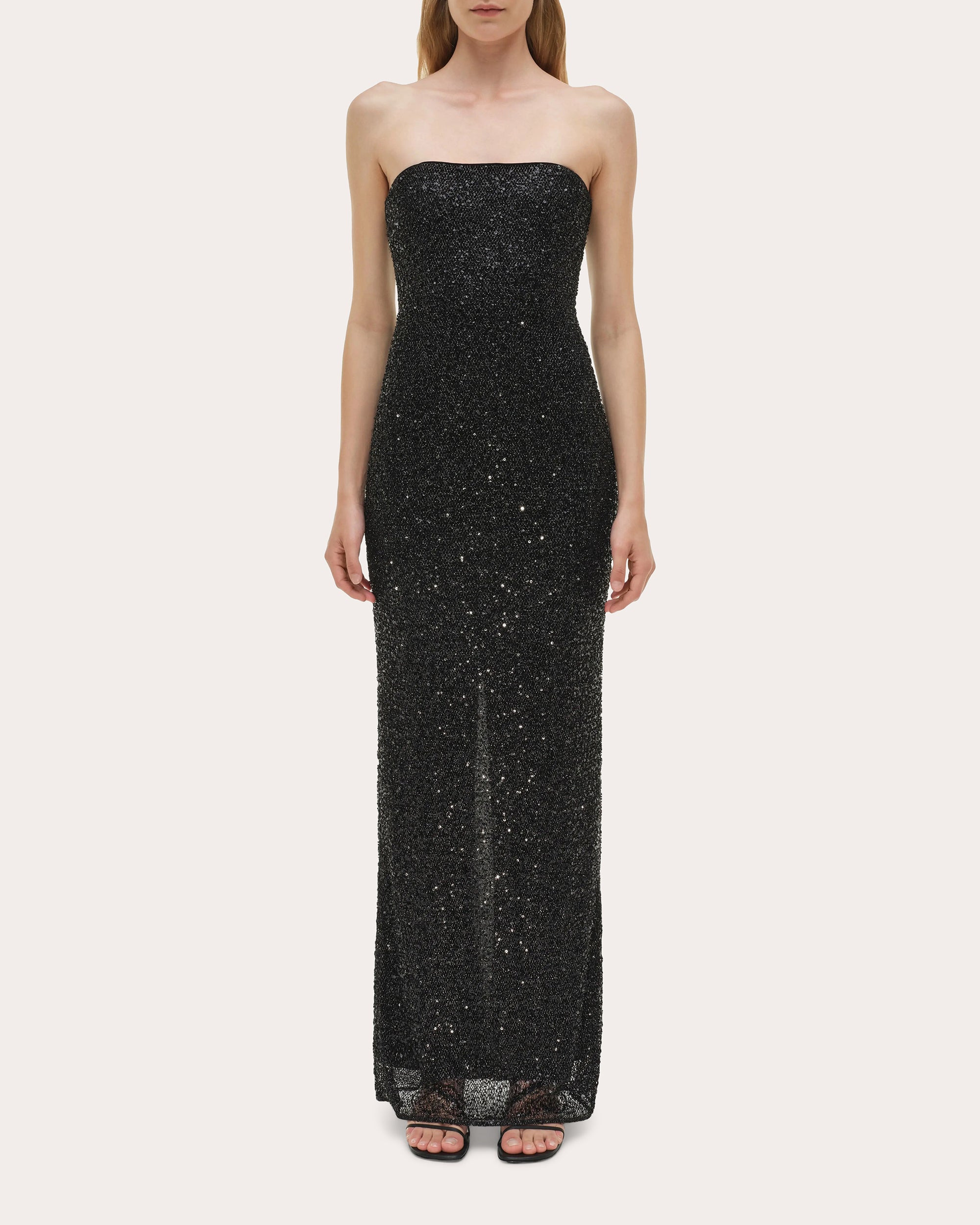 Made to make an entrance, the Xyla gown is overlaid with a sheer, sequin-embellished top layer. A center back slit at the hem creates fluid movement. Designer color: black Back-zip closure Strapless neckline Slit back hem Sheer sequin overlay Partial lining Self: 85% nylon, 15% polyester Lining: 96% polyester, 4% spandex Dry clean only Made in China Size & Fit Model (wearing size US 2): 5ft 10in tall Fits true to size Please note, below measurements reflect SIMKHAI's size chart, not the actual garment. Size US 0: 32in bust, 25in natural waist, 35.5in low hip Size US 2: 33in bust, 26in natural waist, 36.5in low hip Size US 4: 34in bust, 27in natural waist, 37.5in low hip Size US 6: 35.25in bust, 28.25in natural waist, 38.75in low hip Size US 8: 36.5in bust, 29.5in natural waist, 40in low hip Size US 10: 38in bust, 31in natural waist, 41.5in low hip Size US 12: 39.5in bust, 32.5in natural waist, 43in low hip