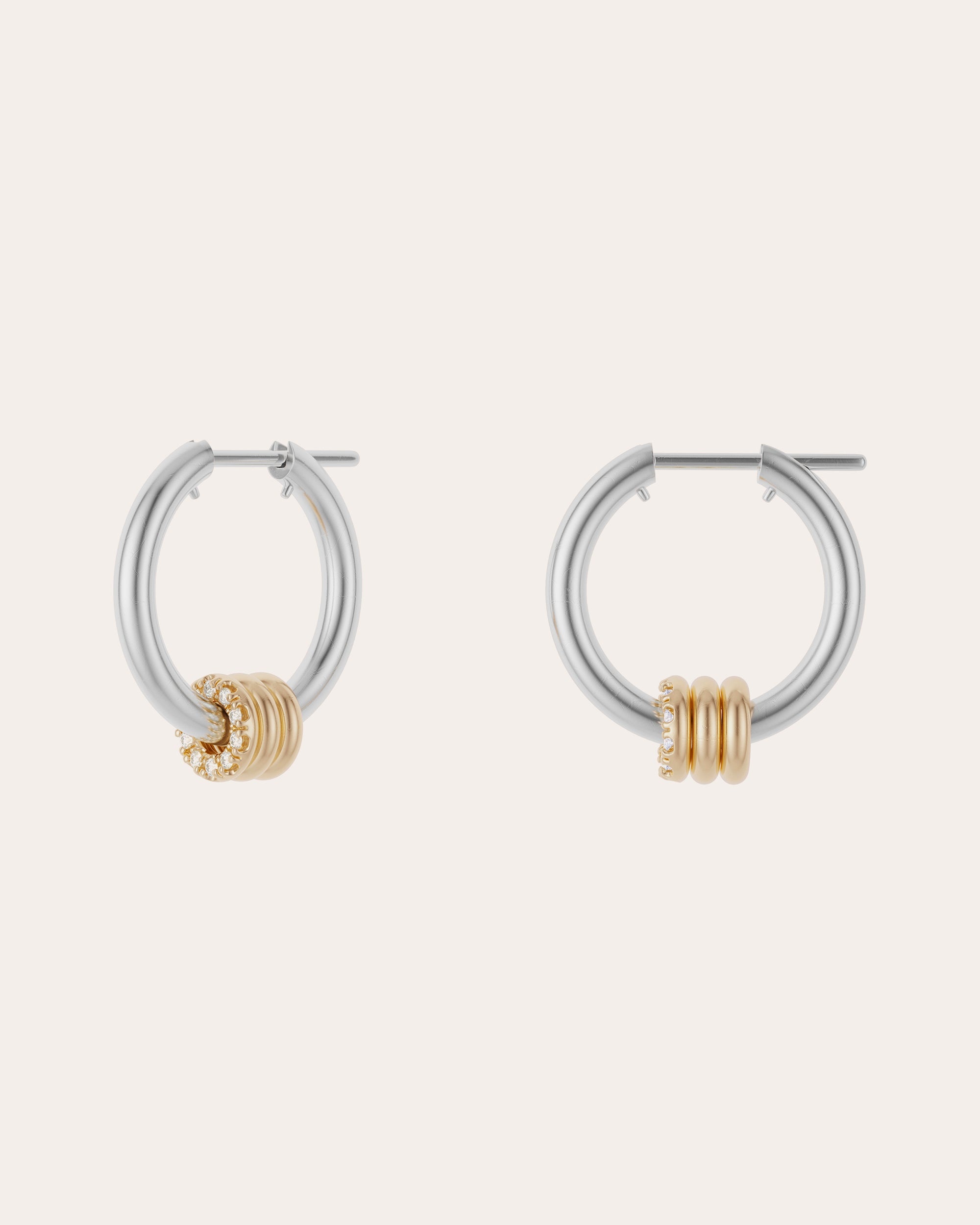 All the classic appeal of a tubular hoop with the dynamic addition of three annulets, these earrings feature a multi-tonal design of sterling silver and 18k yellow gold. Pave white diamonds catch and reflect the light for a truly beguiling look. This item is made to order, please allow 2-8 weeks for shipping. This item is final sale. The recycled metal is made exclusively from repurposed solid 18k gold and .925 silver, with conflict free diamonds and gems, exclusively sourced through respected suppliers in adherence with the Kimberley Process and World Diamond Council System of Warranties. Sterling silver, 18k yellow gold, and white diamond White diamond: 0.01 tcw Hand polish Made in the USA Size & Fit Inner diameter: 13mm Width: 2mm Sustainability Metrics: Circular Economy: product is intentionally designed with 50% of actively cycled materials Conflict-Free: 100% of products are recycled or conflict-free and adhere to fair trade and labor Craft & Community: at least 75% of products are fully sourced and manufactured within the specified community or country; 100% of production adheres to a fair wage system Read more about Olivela's sustainability pillars here .