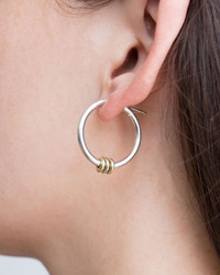 A study in minimalism, the Argo earrings craft their classic hoop shape from solid sterling silver. Three orbiting annulets—one silver and two 18-karat gold—create a tactile, two-tone design. Latch closure Sterling silver and 18k yellow gold Polish with soft cloth Handmade in the USA If you would like to consult with a fine jewelry expert, please email us at jewelryconcierge@olivela.com. Measurements Hoop width: 2.3mm Diameter: 0.78in (20mm)