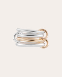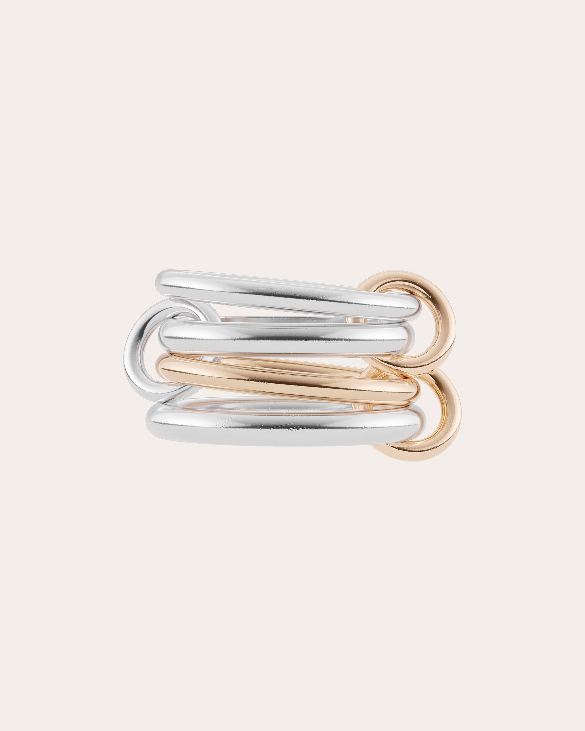 A study in fluid tactility, the Cancer ring features multi-gauged bands connected by orbiting links. The sterling silver and 18-karat gold piece can be worn across multiple fingers or stacked as one. Sterling silver and 18k yellow gold Polish with soft cloth Handmade in the USA Size & Fit 18k gold band width: 2.3mm Sterling silver band widths: 2.3mm, 2.7mm, 2.8mm Sustainability Metrics: Circular Economy: product is intentionally designed with 50% of actively cycled materials Conflict-Free: 100% of products are recycled or conflict-free and adhere to fair trade and labor Craft & Community: at least 75% of products are fully sourced and manufactured within the specified community or country; 100% of production adheres to a fair wage system Read more about Olivela's sustainability pillars here .