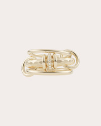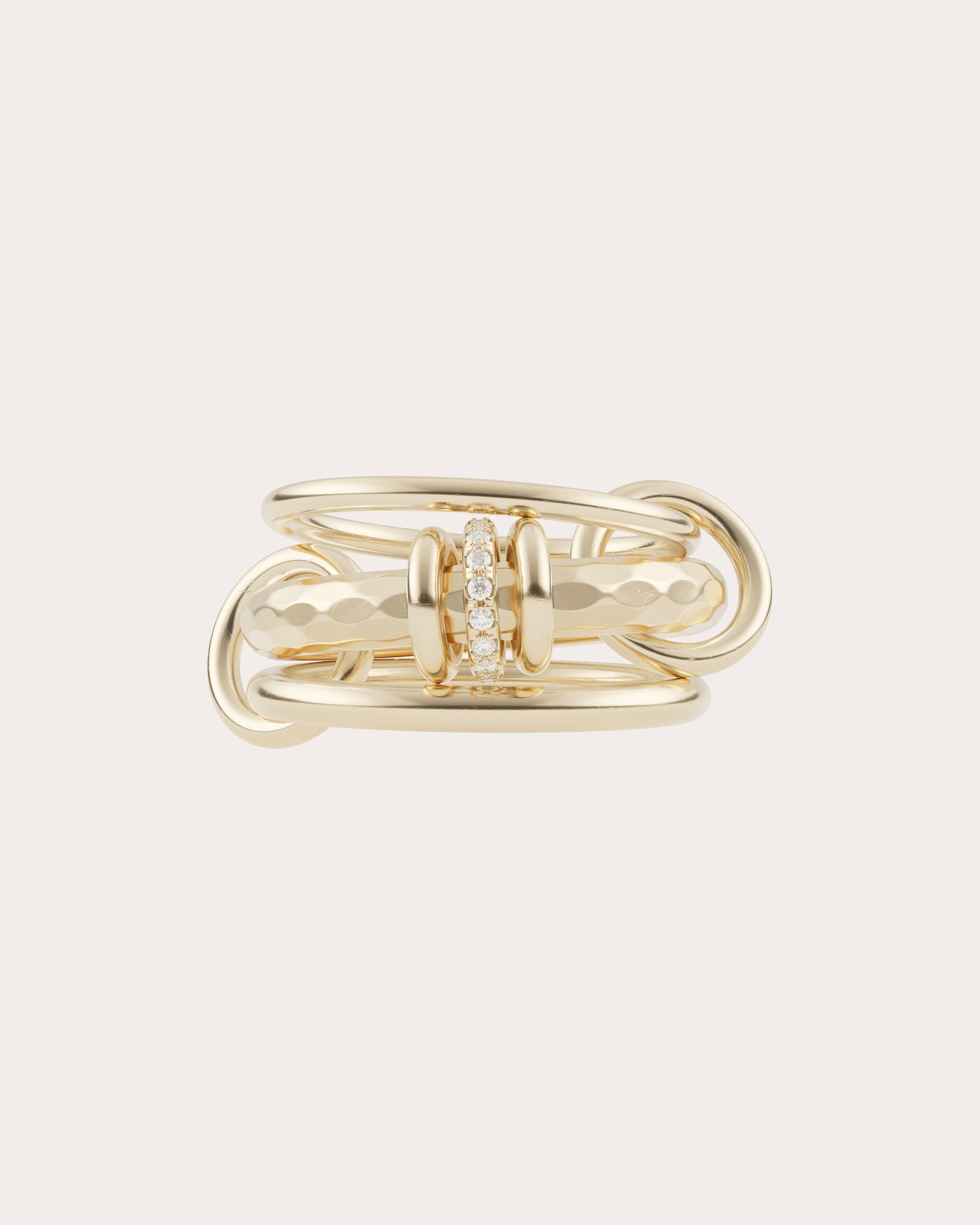 True to the sign's flexibly expressive nature, the Gemini ring features three 18-karat gold bands joined by connecting links that allow the piece to be worn stacked on one finger or spread across multiple. The hammered center band is decorated with a diamond-embellished orbiting annulet for shimmering appeal. 18k yellow gold and white diamond Diamond carat: 0.09 ctw Polish with soft cloth Made in the USA If you would like to consult with a fine jewelry expert, please email us at jewelryconcierge@olivela.com. Measurements Top band width: 1.7mm Middle band width: 3.8mm Bottom band width: 2.3mm