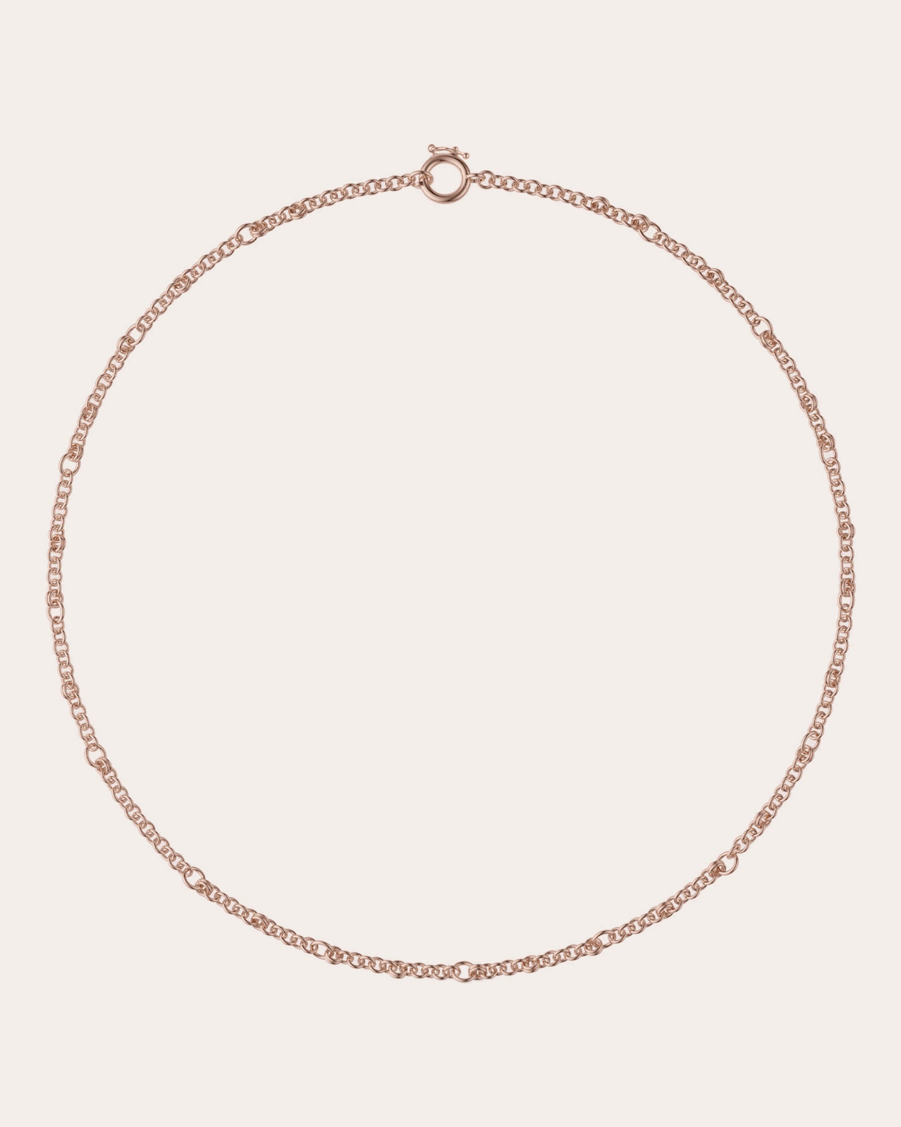 A study in balanced minimalism, the Gravity necklace is forged in 18-karat rose gold and showcases a handmade roll chain comprised of double and various-sized links. Seamless circular clasp with safety closure 18k rose gold Polish with soft cloth Handmade in the USA Size & Fit Chain length: 18in Sustainability Metrics: Circular Economy: product is intentionally designed with 50% of actively cycled materials Conflict-Free: 100% of products are recycled or conflict-free and adhere to fair trade and labor Craft & Community: at least 75% of products are fully sourced and manufactured within the specified community or country; 100% of production adheres to a fair wage system Read more about Olivela's sustainability pillars here .