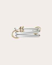 A celebration of simplicity, the Raneth ring features a trio of sterling silver bands, one decorated with solid 18k gold annulets for a tactile touch. Orbiting connectors create a linked design that can be worn stacked on one finger or spread across multiple. 18k yellow gold and sterling silver Polish with soft cloth Handmade in Los Angeles, USA Measurements Top band width: 1.7mm Middle band width: 2.3mm Bottom band width: 2.3mm Sustainability Metrics: Circular Economy: product is intentionally designed with 50% of actively cycled materials Conflict-Free: 100% of products are recycled or conflict-free and adhere to fair trade and labor Craft & Community: at least 75% of products are fully sourced and manufactured within the specified community or country; 100% of production adheres to a fair wage system Read more about Olivela's sustainability pillars here .