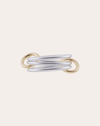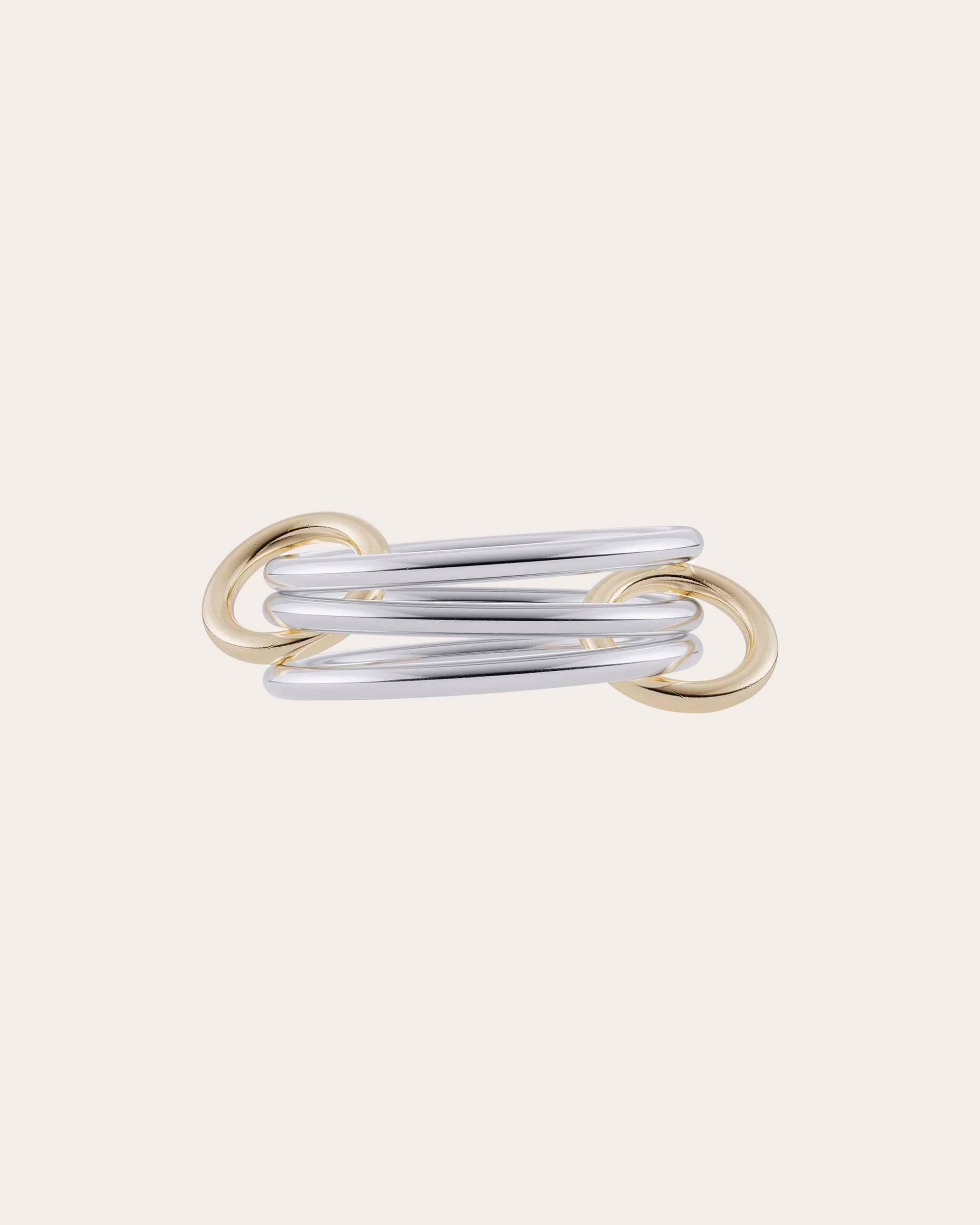Offering luminous multi-tonal palettes with kinetic appeal, this ring features a trio of sterling silver bands linked together by two 18k yellow gold connectors. This item is made to order, please allow 2-8 weeks for shipping. This item is final sale. The recycled metal is made exclusively from repurposed solid 18k gold and .925 silver, with conflict free diamonds and gems, exclusively sourced through respected suppliers in adherence with the Kimberley Process and World Diamond Council System of Warranties. Sterling silver and 18k yellow gold Hand polish Made in the USA Size & Fit Each band width: 1.7mm Sustainability Metrics: Circular Economy: product is intentionally designed with 50% of actively cycled materials Conflict-Free: 100% of products are recycled or conflict-free and adhere to fair trade and labor Craft & Community: at least 75% of products are fully sourced and manufactured within the specified community or country; 100% of production adheres to a fair wage system Read more about Olivela's sustainability pillars here .