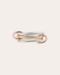 Designed to be your favorite daily piece, this ring features three bands in 18k yellow gold and sterling silver, linked by two matching 18k rose gold connectors. This item is made to order, please allow 2-8 weeks for shipping. This item is final sale. The recycled metal is made exclusively from repurposed solid 18k gold and .925 silver, with conflict free diamonds and gems, exclusively sourced through respected suppliers in adherence with the Kimberley Process and World Diamond Council System of Warranties. Sterling silver, 18k yellow gold, and 18k rose gold Hand polish Made in the USA Size & Fit Each band width: 1.7mm Sustainability Metrics: Circular Economy: product is intentionally designed with 50% of actively cycled materials Conflict-Free: 100% of products are recycled or conflict-free and adhere to fair trade and labor Craft & Community: at least 75% of products are fully sourced and manufactured within the specified community or country; 100% of production adheres to a fair wage system Read more about Olivela's sustainability pillars here .