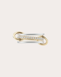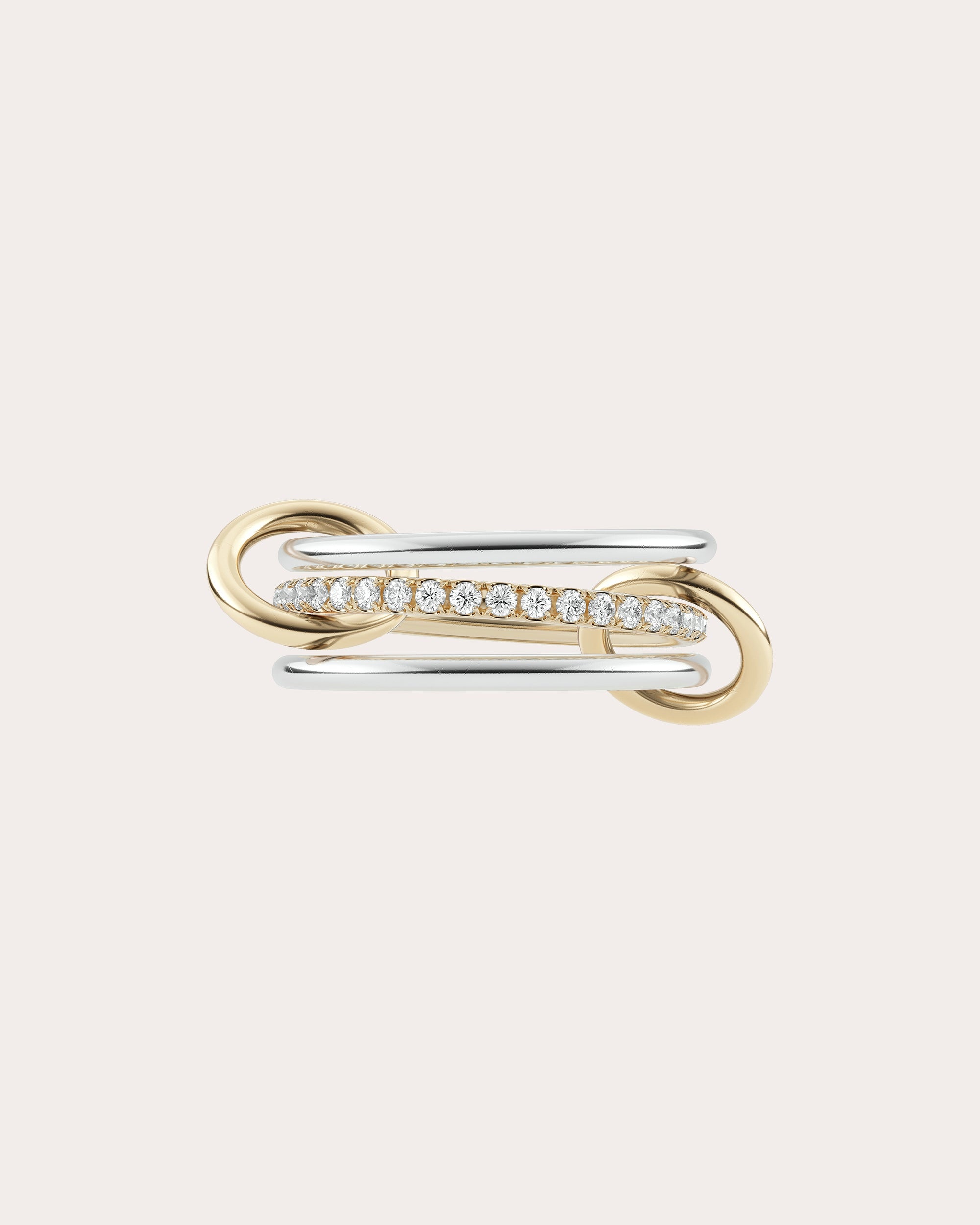 Forged with simplicity in mind, the Sonny ring features a trio of 18-karat bands—two white gold and one diamond-embellished yellow gold. Orbiting annulet connectors create a linked design that can be worn stacked on one finger or spread across multiple. 18k yellow gold, 18k white gold and white diamond Diamond carat: 0.5 ctw Polish with soft cloth Made in the USA Measurements Band widths (each): 1.7mm Sustainability Metrics: Circular Economy: product is intentionally designed with 50% of actively cycled materials Conflict-Free: 100% of products are recycled or conflict-free and adhere to fair trade and labor Craft & Community: at least 75% of products are fully sourced and manufactured within the specified community or country; 100% of production adheres to a fair wage system Read more about Olivela's sustainability pillars here .