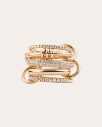Comprised of five linked bands in 18k yellow gold, this stacking ring features pave white diamonds and a collection of four matching gold connectors. This item is made to order, please allow 2-8 weeks for shipping. This item is final sale. The recycled metal is made exclusively from repurposed solid 18k gold and .925 silver, with conflict free diamonds and gems, exclusively sourced through respected suppliers in adherence with the Kimberley Process and World Diamond Council System of Warranties. 18k yellow gold and white diamond White diamond: 2.9 tcw Hand polish Made in the USA Size & Fit Yellow gold band width: 1.7mm, 2.3mm, and 3.8mm Yellow gold 1/2 round band: 2.7mm Sustainability Metrics: Circular Economy: product is intentionally designed with 50% of actively cycled materials Conflict-Free: 100% of products are recycled or conflict-free and adhere to fair trade and labor Craft & Community: at least 75% of products are fully sourced and manufactured within the specified community or country; 100% of production adheres to a fair wage system Read more about Olivela's sustainability pillars here .